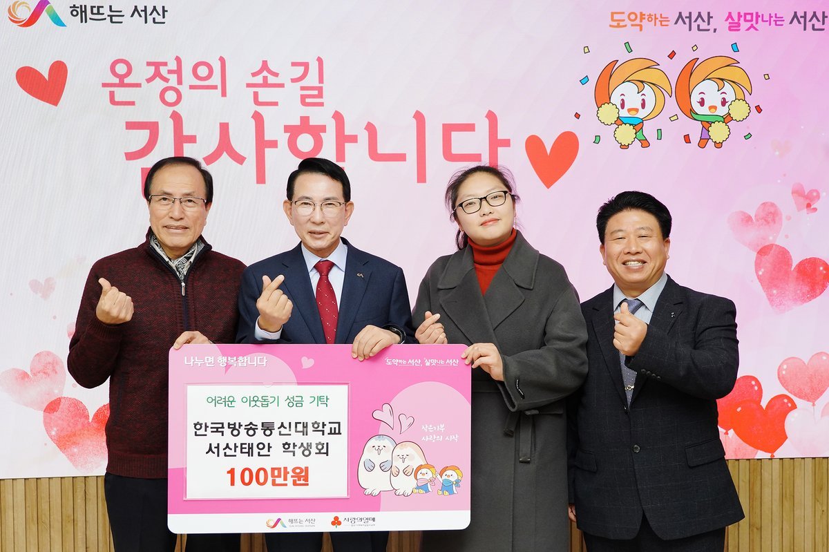 서산시, 연말 지역사회 따뜻한 나눔 이어져 [PEDIEN] 서산시에 연말을 맞아 따뜻한 나눔의 손길이 이어지고 있다. 몬스터FC 축구센터와 한국방송통신대학교 서산태안학생회가 어려운 이웃을 위한 기탁금을 전달하며 훈훈함을 더했다.몬스터FC 축구센터는 27일, 600만원 상당의 쌀 2톤을 서산시에 기탁했다. 김남하 센터장은 딸과 함께 기탁식에 참석하여 나눔의 의미를 되새기는 시간을 가졌다. 김 센터장은 청소년들이 기부 문화를 자연스럽게 접하는 계기가 되기를 바란다고 전했다.같은 날, 한국방송통신대학교 서산태안학생회도 서산시에 이웃돕기 성금 100만원을 전달했다. 이 성금은 학생들이 지난 10월 일일 찻집을 운영하여 얻은 수익금으로 마련되었다. 이상민 학생회장은 작은 나눔이지만 이웃들에게 도움이 되기를 바란다고 밝혔다.이완섭 서산시장은 몬스터FC 축구센터와 한국방송통신대학교 서산태안학생회의 따뜻한 마음에 감사를 표했다. 시는 전달된 쌀과 성금을 충남사회복지공동모금회를 통해 관내 어려운 이웃에게 전달할 예정이다. 이번 나눔 활동은 추운 겨울, 지역 사회에 따뜻한 온기를 불어넣을 것으로 기대된다. -