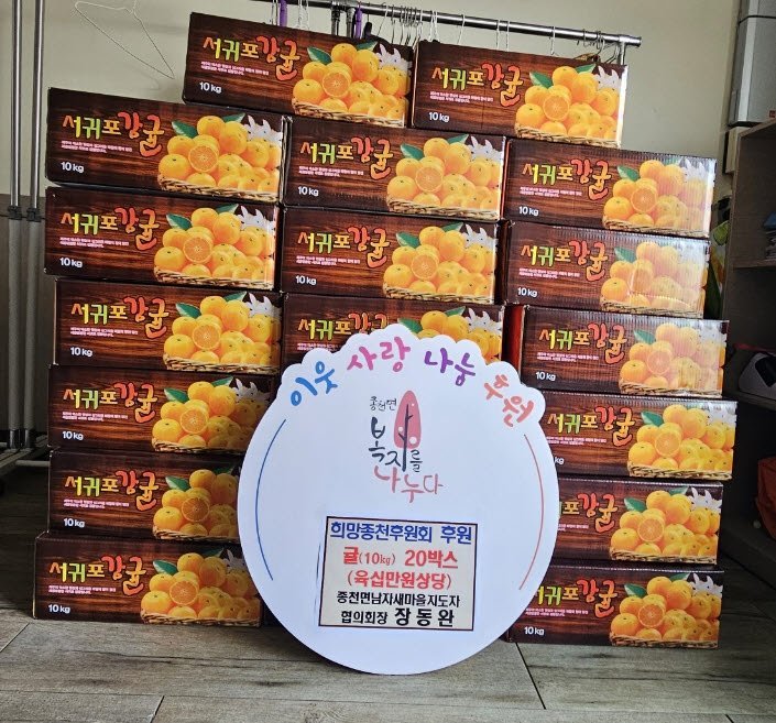 종천면 새마을남자지도자협의회 장동완 회장, 경로당에 귤 나눔 (서천군 제공) [PEDIEN] 서천군 종천면 새마을남자지도자협의회 장동완 회장이 지난 12일, 종천면 관내 경로당 어르신들을 위해 따뜻한 마음을 전했다.장 회장은 어르신들의 겨울철 건강을 기원하며 귤 20박스를 흔쾌히 기탁했다.이번에 전달된 귤은 종천면 내 20개 경로당에 고루 전달될 예정이다. 경로당을 이용하는 어르신들은 귤을 함께 나누며 추운 겨울에 서로의 안부를 묻고 정을 나누는 시간을 가질 수 있게 됐다.장동완 회장은 “어르신들이 귤을 드시면서 잠시나마 따뜻함을 느끼고, 건강하게 겨울을 보내시길 바란다”고 소감을 밝혔다.이명란 종천면장은 “어르신들을 위한 장동완 회장의 따뜻한 나눔에 깊이 감사드린다”며, “앞으로도 어르신들이 쾌적하고 행복한 환경에서 건강하게 지내실 수 있도록 최선을 다하겠다”고 말했다. 종천면은 앞으로도 어르신들의 건강과 안전을 최우선으로 고려하며, 경로당 환경 개선에 힘쓸 계획이다. -