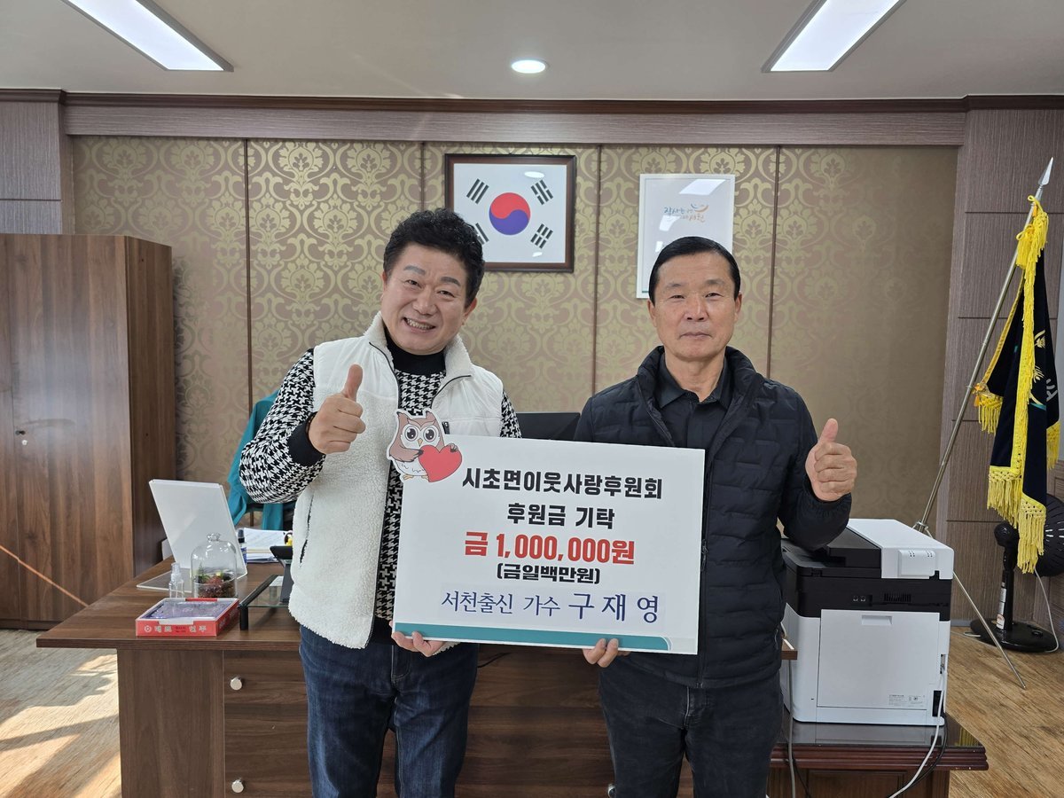 가수 구재영, 고향 시초면에 후원금 100만 원 기탁 (서천군 제공) [PEDIEN] 트로트 가수 구재영이 고향인 서천군 시초면의 어려운 이웃을 위해 100만원의 후원금을 기탁하며 따뜻한 마음을 전했다.구재영은 시초면이웃사랑후원회에 전달된 이번 후원금을 통해 지역사회에 온정을 더했다.그는 지난해 서천특화시장 화재 피해 지원을 위한 모금 행사에도 100만원을 기탁하는 등 꾸준히 고향을 위한 나눔을 실천해왔다.뿐만 아니라 지역 행사 재능기부와 봉사활동에도 적극 참여하며 지역 주민들과 끈끈한 유대감을 이어가고 있다.특히 구재영은 자신의 귀향길에서 얻은 영감을 바탕으로 만든 곡 '장항선'을 통해 서천군을 널리 알리는 데 기여했다.오는 12월에는 마량포구의 명소인 '동백정'을 소재로 한 신곡을 발표할 예정이어서 기대를 모으고 있다.구재영은 “고향에 작은 보탬이 될 수 있어 기쁘다”며 앞으로도 음악을 통해 나눔을 실천하겠다는 뜻을 밝혔다.장건용 후원회장은 “꾸준한 후원과 재능기부로 지역사회에 귀감이 되고 있다”며 감사의 마음을 전했다.한편 구재영은 '2025 영동세계국악엑스포' 명예홍보대사 등 다양한 기관의 홍보대사로 활동하며 사회공헌 활동을 꾸준히 이어가고 있다. -