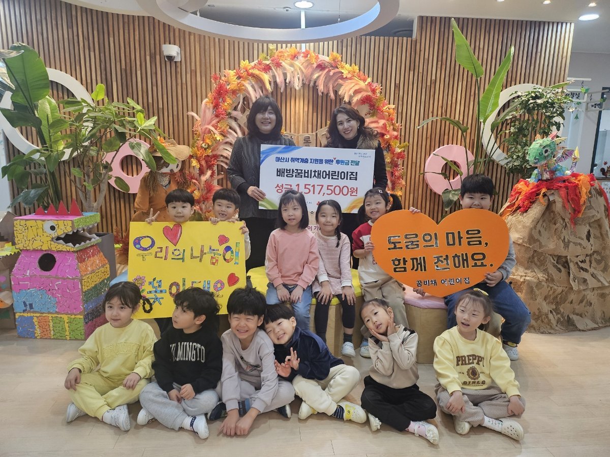 아산 배방 꿈비채어린이집, 아이들의 따뜻한 마음 모아 성금 기탁 (아산시 제공) [PEDIEN] 아산 꿈비채어린이집 원생들이 고사리손으로 마련한 성금 151만 7천500원을 지역 취약계층을 위해 기탁하며 따뜻한 나눔을 실천했다.아이들의 순수한 마음이 담긴 성금은 충남사회복지공동모금회를 통해 아산시 저소득 가정과 복지 사각지대에 놓인 이웃들을 위한 사업에 쓰일 예정이다.꿈비채어린이집은 원아들이 사용하지 않는 장난감 등을 모아 아나바다 바자회를 열었고, 여기서 발생한 수익금 전액을 기부하기로 결정했다. 아이들은 자신들이 아끼던 물건을 기꺼이 내놓으며 어려운 친구들에게 도움이 되기를 바라는 마음을 전했다.송희정 꿈비채어린이집 원장은 아이들이 바자회를 통해 나눔의 기쁨을 배우고 서로 격려하는 모습에 감동받았다고 밝혔다. 아이들의 순수한 마음이 세상을 변화시킬 수 있다는 희망을 느꼈다는 소감도 덧붙였다.김민숙 아산시 사회복지과장은 아이들의 따뜻한 마음이 큰 결실로 이어졌다며 감사를 표했다. 아이들의 작은 실천이 지역사회에 귀한 울림을 주고 사회를 더욱 아름답게 만드는 밑거름이 될 것이라고 전망했다. -