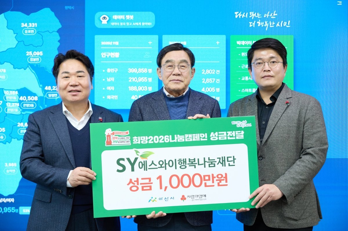 에스와이행복나눔재단, ‘희망2026나눔캠페인’성금 1000만 원 기부 (아산시 제공) [PEDIEN] 에스와이행복나눔재단이 15일 아산시에 방문해 ‘희망2026나눔캠페인’성금 1000만 원을 기탁했다.에스와이행복나눔재단 김철호 이사장은 “도움이 필요한 이웃들이 따뜻한 겨울을 보낼 수 있도록 작은 정성을 보태게 되어 기쁘다”며 “앞으로도 지역사회와 함께 나눔 문화를 확산시키고, 함께 행복한 공동체를 만들어가는 데 지속적으로 기여하겠다”고 밝혔다.오세현 아산시장은 “지역사회를 위해 큰 성금을 기부해주신 에스와이 행복나눔재단에 깊은 감사를 드린다”며 “이러한 따뜻한 나눔의 손길이 우리 지역을 더욱 살기 좋은 곳으로 만드는 원동력이 되고 있다”고 감사를 표했다.에스와이그룹은 2017년 8월 에스와이행복나눔재단을 설립하여 저소득층 사랑의 집짓기와 주거환경 개선 사업, 아동 지원사업, 사회복지시설 개보수, 사랑의 김치 나눔 지원사업 등 다양한 사업을 통해 사회공헌활동을 활발히 펼치고 있다.한편, ‘희망2026나눔캠페인’은 ‘행복을 더하는 기부, 기부로 바꾸는 아산’이라는 슬로건으로 2026년 1월 31일까지 진행되며, 캠페인을 통해 모인 성금은 아산시 취약계층을 위한 ‘신사회문제’대응, 사회안전망 지원, 지역사회 돌봄 지원, 교육 및 자립 역량 강화라는 네 가지 핵심 분야에 중점으로 지원된다. -