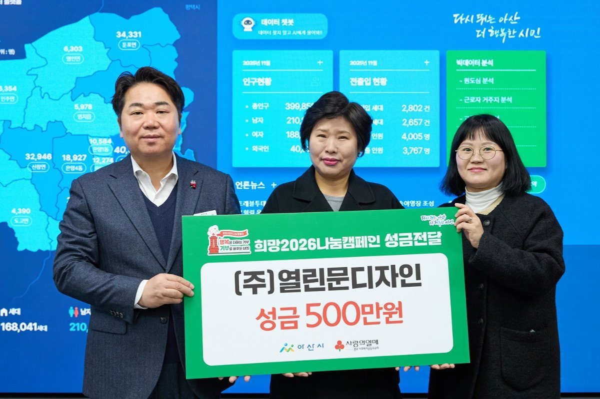 ㈜열린문디자인, ‘희망2026나눔캠페인’이웃사랑 성금 500만 원 후원 (아산시 제공) [PEDIEN] 아산시의 디자인 전문 기업인 ㈜열린문디자인이 희망2026나눔캠페인에 성금 500만원을 기탁하며 지역 사회에 따뜻한 온정을 전했다.이번 기부는 어려운 이웃들이 따뜻한 겨울을 보내는 데 조금이나마 보탬이 되고자 하는 마음에서 비롯되었다. 열린문디자인은 앞으로도 지역사회와 함께 성장하는 기업이 되겠다는 의지를 밝혔다.오세현 아산시장은 열린문디자인의 나눔 실천에 감사를 표하며, 이러한 기부 문화가 아산시 전역으로 확산되기를 희망했다. 시는 열린문디자인의 따뜻한 마음이 어려운 이웃들에게 큰 힘이 될 것이라고 강조했다.희망2026나눔캠페인은 '행복을 더하는 기부, 기부로 바꾸는 아산'이라는 슬로건 아래 2026년 1월 31일까지 진행된다. 모금된 성금은 아산시 취약계층을 위한 신사회문제 대응, 사회안전망 지원, 지역사회 돌봄 지원, 교육 및 자립 역량 강화 등 네 가지 핵심 분야에 집중적으로 사용될 예정이다.열린문디자인의 이번 기부는 지역 기업이 솔선수범하여 나눔을 실천하는 모범 사례로, 아산시의 기부 문화 확산에 긍정적인 영향을 미칠 것으로 기대된다. -
