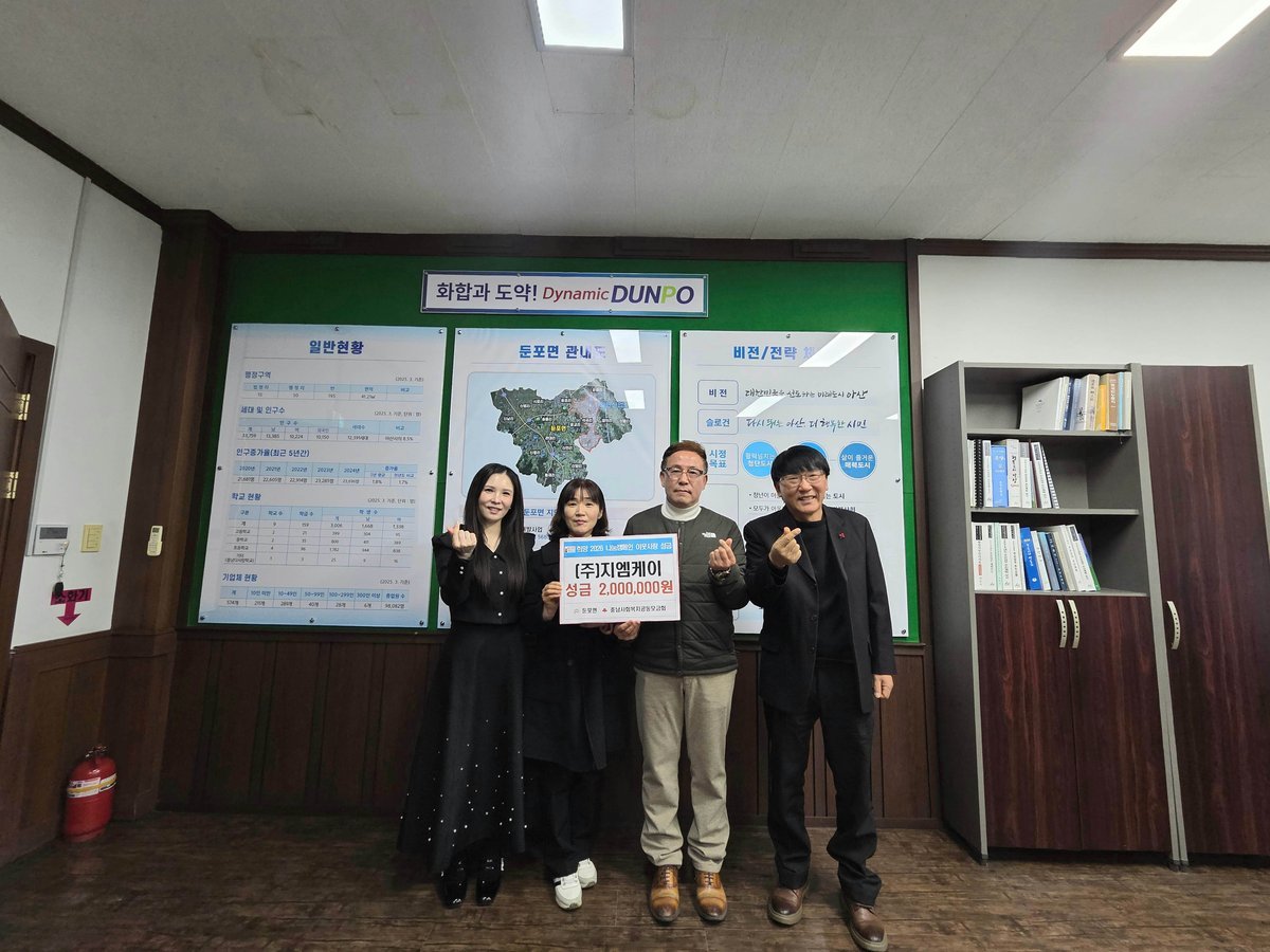 지엠케이, ‘희망2026 나눔캠페인’성금 200만 원 전달 (아산시 제공) [PEDIEN] 아산시 둔포면에 위치한 ㈜지엠케이가 희망2026 나눔캠페인에 성금 200만원을 기탁하며 따뜻한 나눔을 실천했다.지엠케이는 지난 15일 둔포면 행정복지센터를 방문하여 성금을 전달했다. 이로써 지엠케이는 7년째 나눔캠페인에 참여하며 지역사회에 꾸준한 사랑을 전하고 있다.이주형 지엠케이 대표이사는 “지역사회에 조금이나마 보탬이 되고자 매년 나눔캠페인에 동참하고 있다”며 “작은 정성이지만 어려운 이웃들에게 도움이 되기를 바란다”고 밝혔다.이모완 둔포면장은 “매년 잊지 않고 나눔을 실천해 주신 ㈜지엠케이 대표이사님과 임직원 여러분께 감사드린다”며 감사의 뜻을 전했다. 또한 “전달된 성금은 도움이 필요한 이웃들에게 소중히 전달하겠다”고 약속했다.한편 희망2026 나눔캠페인은 내년 1월 31일까지 진행된다. 참여를 희망하는 개인, 단체, 기업은 둔포면 행정복지센터 복지행정팀으로 문의하면 된다. -