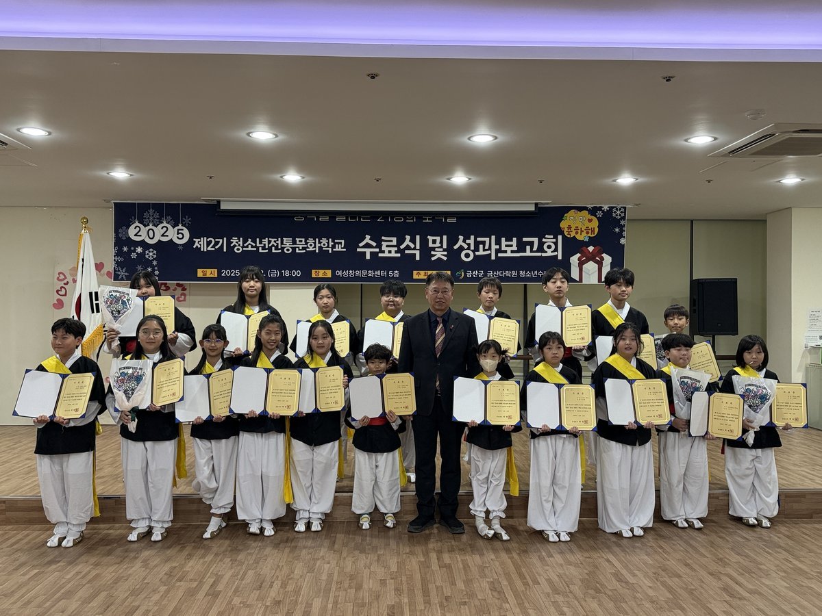 금산다락원 청소년수련관, 2025년 제2기 청소년전통문화학교 수료식 성료 (금산군 제공) [PEDIEN] 금산다락원 청소년수련관이 2025년 제2기 청소년전통문화학교 수료식을 금산읍 여성창의문화센터에서 개최했다. 이번 수료식은 지난 12일에 열렸으며, 청소년 수료생과 학부모, 관계자 등 60여 명이 참석하여 자리를 빛냈다.참석자들은 지난 2월부터 12월까지 진행된 교육의 성과를 함께 나누고, 금산 지역 전통문화의 중요성을 되새기는 시간을 가졌다. 특히 금산농악보존회의 축하 공연은 수료식의 분위기를 한층 고조시켰다.청소년전통문화학교는 금산 지역 청소년들에게 지역 전통문화의 우수성을 알리고, 올바른 인성을 함양하기 위해 마련된 프로그램이다. 올해 참가 청소년들은 평택지영희 전국국악경연대회 초등부 타악 부문에서 평택시장상을 수상하는 쾌거를 이뤘다. 또한 충남 청소년운영위원회 연합캠프 식전공연, 금산세계인삼축제 연계 공연 등 다양한 무대에서 실력을 뽐냈다. 참여 청소년들의 만족도는 매우 높았다.수료식에서는 활동 영상 상영과 청소년들이 직접 선보이는 금산 농악 공연이 진행되어 의미를 더했다. 또한 내년 프로그램 계획에 반영하기 위한 의견 수렴 시간도 가졌다.금산다락원 청소년수련관 관계자는 청소년전통문화학교를 통해 청소년들이 전통문화를 직접 체험하며 역사와 문화에 대한 이해와 자긍심을 높였다고 평가했다. 앞으로도 청소년들이 바른 인성을 갖춘 미래 인재로 성장할 수 있도록 다양한 전통문화 교육 프로그램을 지속적으로 발굴하고 운영할 계획이라고 밝혔다. 내년 청소년전통문화학교 참여 문의는 금산다락원 청소년수련관에서 가능하다. -