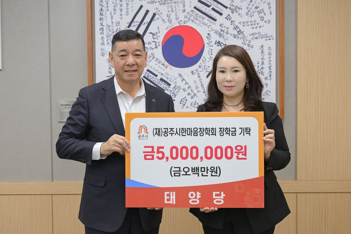 태양당 재 공주시한마음장학회 장학금 기탁 공주시 제공 [PEDIEN] 태양당 이은혜 대표가 지난 12일 공주시에 장학금 500만원을 기탁하며 지역 사회에 훈훈한 감동을 전했다.공주시한마음장학회 이사로도 활동 중인 이 대표의 이번 기탁은 지역 인재 육성에 대한 깊은 관심과 애정을 보여주는 행보로 풀이된다.이 대표는 “작은 정성이지만 학생들이 꿈을 키우는 데 도움이 되기를 바란다”며 지속적인 나눔 활동을 통해 지역사회와 교육 발전에 기여하겠다는 뜻을 밝혔다.평소 봉황중학교 학부모회와 공주시학교운영위원회 활동을 통해 공주시 교육 발전에 헌신해 온 이 대표의 이번 장학금 기탁은 더욱 의미가 깊다.최원철 공주시장은 “지역 사회의 꾸준한 나눔 실천에 감사드린다”며 “기탁금은 공주의 미래를 짊어질 인재 양성에 소중하게 사용하겠다”고 화답했다.한편, 공주시한마음장학회는 올해에만 총 726건, 9048만원의 장학금을 기탁받는 등 시민들과 지역 단체의 따뜻한 참여가 이어지고 있다.이러한 나눔의 손길은 공주시의 밝은 미래를 위한 든든한 밑거름이 될 것으로 기대된다. -