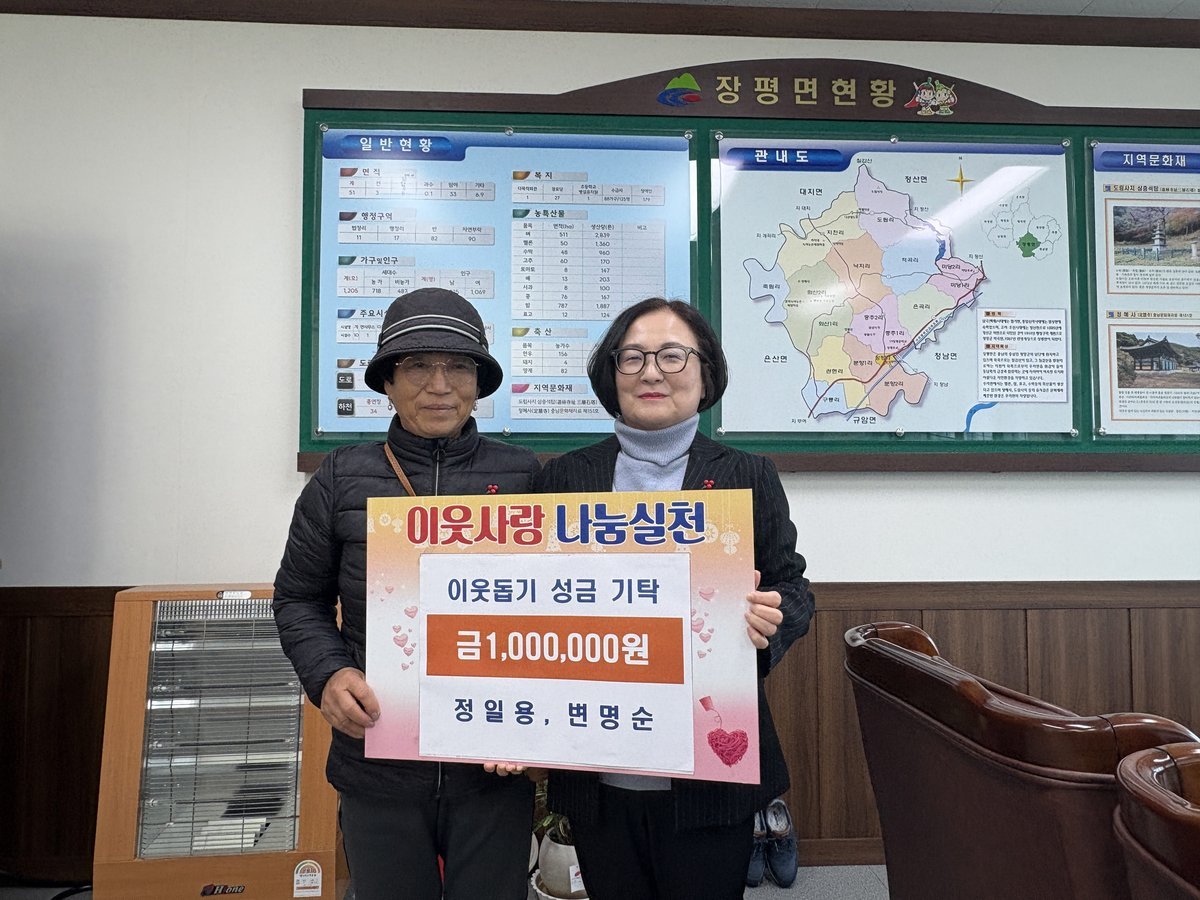 장평면 분향2리 정일용 변명순 부부 이웃돕기 성금 총 300만원 기탁 청양군 제공 [PEDIEN] 청양군 장평면 분향2리에 거주하는 정일용·변명순 부부가 7년째 꾸준한 이웃사랑을 실천하며 지역사회에 따뜻한 온정을 전하고 있다.최근 정일용·변명순 부부는 어려운 이웃을 돕기 위한 성금 300만원을 기탁했다. 이들의 나눔은 2017년부터 시작되어 올해로 7년째 이어지고 있다.부부는 해마다 어려운 이웃을 위한 현물 나눔을 실천하며 지역사회에 귀감이 되어 왔다. 평소에도 이웃에 대한 관심과 배려를 아끼지 않는 이들의 꾸준한 선행은 지역 사회에 나눔 문화를 확산하는 데 긍정적인 영향을 미치고 있다.정일용 씨는 “작은 정성이지만 힘든 시기를 보내고 있는 이웃들에게 조금이나마 도움이 되기를 바라는 마음으로 성금을 전달하게 됐다”며 “모두가 서로를 응원하며 따뜻한 겨울을 보냈으면 좋겠다”고 소감을 밝혔다.김돈곤 청양군수는 “매년 잊지 않고 이웃사랑을 실천해 주시는 정일용·변명순 부부께 깊이 감사드린다”며 “기탁해 주신 소중한 성금은 꼭 필요한 분들께 정성껏 전달해 복지 체감도를 높이겠다”고 말했다.기탁된 성금은 장평면 내 저소득층과 복지 사각지대에 놓인 이웃들의 생활 안정과 복지 지원을 위해 사용될 예정이다. 청양군은 도움이 필요한 가구에 실질적인 지원이 이루어질 수 있도록 성금을 세심하게 전달할 계획이다.청양군은 민간의 자발적인 기부와 나눔 활동이 지역 복지의 중요한 부분이라고 판단하고, 앞으로도 다양한 나눔 참여를 장려하기 위해 적극적인 연계와 지원을 이어갈 방침이다. -