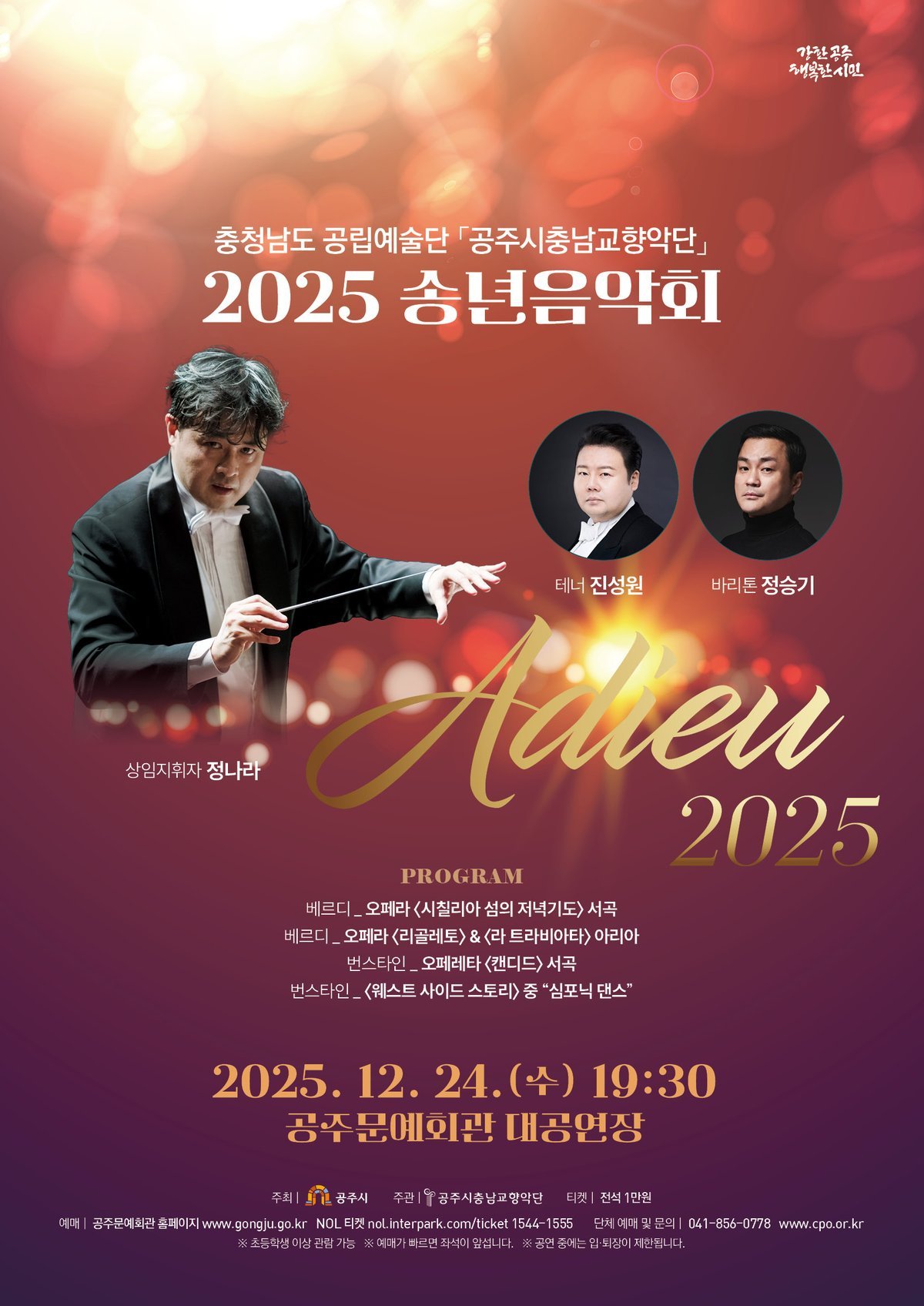 공주시충남교향악단, 송년음악회 ‘Adieu 2025’24일 개최 (공주시 제공) [PEDIEN] 공주시충남교향악단이 오는 12월 24일 오후 7시 30분, 공주문예회관 대공연장에서 송년음악회 'Adieu 2025'를 개최한다.이번 음악회는 다사다난했던 한 해를 마무리하고, 성탄의 기쁨과 희망찬 새해를 맞이하는 의미를 담아 기획됐다.정나라의 지휘 아래, 베르디 오페라 '시칠리아 섬의 저녁기도' 서곡으로 막을 올린다.이어 테너 진성원과 바리톤 정승기가 출연, 베르디와 푸치니 오페라의 아름다운 아리아를 선사하며 깊은 감동을 전할 예정이다.2부에서는 번스타인의 다채로운 음악이 펼쳐진다.오페레타 '캔디드' 서곡의 경쾌함과 '웨스트 사이드 스토리' 중 '심포닉 댄스'의 열정적인 리듬이 연말 분위기를 뜨겁게 달굴 것으로 보인다.공주시충남교향악단은 이번 송년음악회가 시민들에게 따뜻한 위로와 활력을 주는 특별한 시간이 될 것으로 기대한다.입장료는 전석 1만원이며, 초등학생 이상 관람 가능하다. 예매는 공주문예회관 누리집과 NOL티켓에서 할 수 있다. -