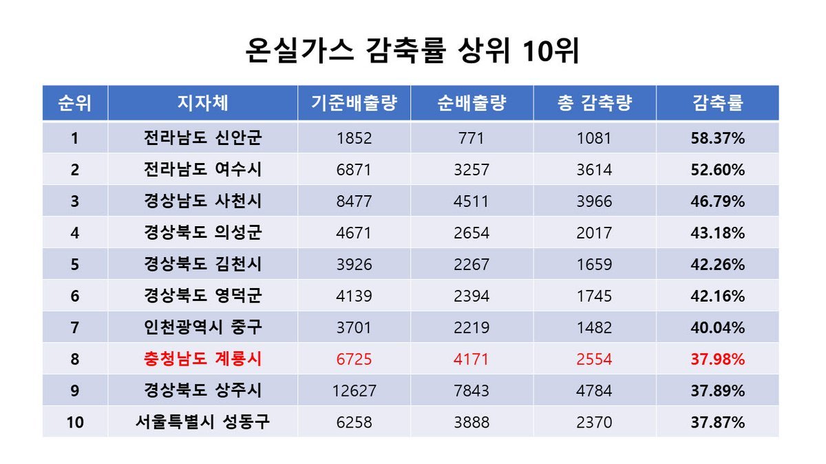 온실가스 감축률 상위 10위권 지자체들 [PEDIEN] 계룡시가 공공부문 온실가스 감축률 평가에서 전국 243개 지방자치단체 중 8위를 차지하며, 충청남도 내에서 유일하게 상위 10개 기관에 이름을 올렸다.계룡시는 2024년 기준 배출량 대비 37.98%의 온실가스 감축 실적을 기록했다. 이는 정부, 지자체, 공공기관이 함께 온실가스 배출 감축 목표를 설정하고 이행하는 '공공부문 온실가스 목표관리제'에 따른 결과다.계룡시의 이번 성과는 국가 온실가스 감축 정책의 핵심 지표 달성에 기여했다는 평가를 받는다. 특히, 기후변화에 적극적으로 대응하고 에너지 절감을 실천한 모범 사례로 주목받고 있다.이응우 계룡시장은 지속적인 온실가스 저감 노력과 시민들의 적극적인 참여가 있었기에 가능했다고 밝혔다. 앞으로도 실효성 있는 정책과 실행 방안을 마련하여 환경 보호와 에너지 절약을 지속적으로 추진할 계획이라고 덧붙였다.한편, 계룡시는 2023년 기후위기에 대응하기 위한 '2045 계룡시 탄소중립 비전'을 선포하고 청정에너지 확대와 친환경 도시 조성을 목표로 다양한 사업을 추진하고 있다.계룡시는 이번 성과를 바탕으로 지속 가능한 도시 기반을 마련하기 위한 노력을 계속해 나갈 방침이다. -