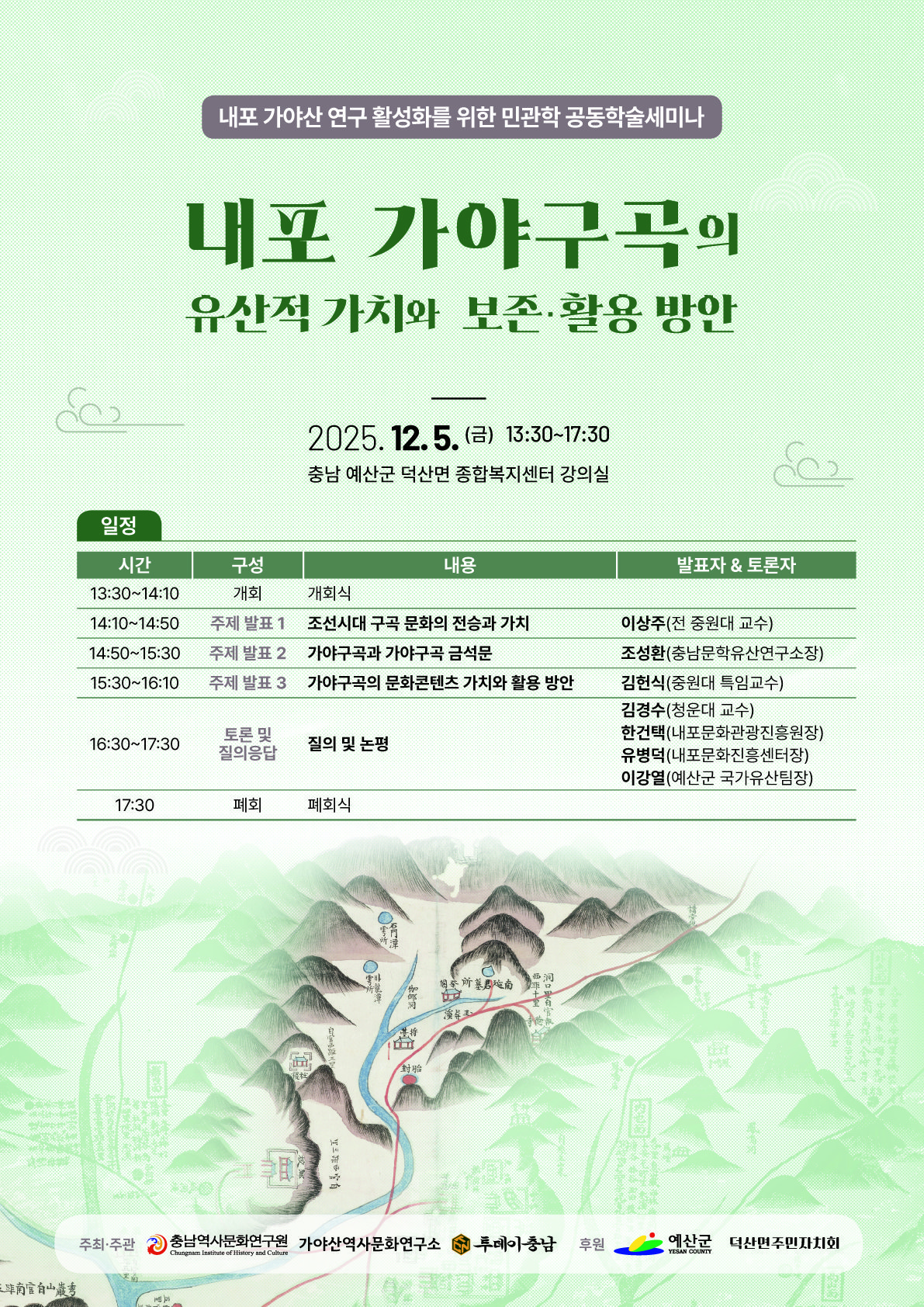 [PEDIEN] 충남 예산군 덕산면에서 내포 가야구곡의 가치를 재조명하는 학술세미나가 12월 5일 개최된다.충남역사문화연구원과 가야산역사문화연구소가 공동 주최하는 이번 행사는 가야산 가야구곡의 유산적 가치를 새롭게 발견하고, 이를 보존하고 활용할 수 있는 방안을 논의하기 위해 마련됐다.가야구곡은 조선 시대 선비들이 자연을 벗 삼아 풍류를 즐기며 학문적 수양을 쌓던 장소다. 예산군 덕산면 상가리 덕산천 상류 계곡에 위치한 아홉 개의 명소로, 현재 옥병계, 와룡담 등의 금석문이 남아 그 역사적 흔적을 보여준다.세미나에서는 조선시대 구곡 문화의 전통과 유산, 가야산 가야구곡의 역사와 가치, 그리고 가야구곡의 문화 콘텐츠로서의 활용 방안에 대한 발표가 진행된다.이상주 전 중원대학교 교수는 ‘조선시대 구곡 문화의 전승과 가치’에 대해, 조성환 충남문학유산연구소장은 ‘가야구곡과 가야구곡 금석문’에 대해, 김헌식 중원대학교 특임교수는 ‘가야구곡의 문화콘텐츠 가치와 활용방안’에 대해 각각 발표한다.이어 김경수 청운대학교 교수, 한건택 내포문화관광진흥원장, 유병덕 내포문화진흥센터장, 이강열 예산군 국가유산팀장이 참여하는 토론에서는 가야산 가야구곡의 보존과 활용에 대한 심도 깊은 논의가 이루어질 예정이다.장기승 충남역사문화연구원장은 “가야산은 불교 문화뿐만 아니라 조선시대 유학자들의 정신이 깃든 구곡 문화도 중요한 의미를 지닌다”며, “앞으로 내포문화진흥센터를 통해 가야산 구곡 문화에 대한 학술 연구와 활용 사업을 적극적으로 추진할 계획”이라고 밝혔다.