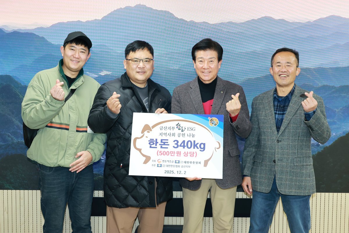 금산군, 대한한돈협회 금산군지부 국산 돼지고기 기탁식 개최 (금산군 제공) [PEDIEN] 금산군이 대한한돈협회 금산군지부로부터 500만원 상당의 돼지고기 340kg을 기탁받았다.이번 기탁은 대한한돈협회 금산군지부가 한돈자조금과 함께 추진하는 ESG 지역사회공헌 사업의 일환으로 진행됐다.기탁된 돼지고기는 충남사회복지공동모금회를 통해 금산군 내 저소득 취약계층 10개 읍면에 전달되어 따뜻한 온정을 나눴다.대한한돈협회 금산군지부는 지난해에 이어 올해도 꾸준히 나눔을 실천하며 지역사회에 기여하고 있다.양용석 지부장은 “한돈자조금 관리위원회의 후원으로 나눔 행사를 지속할 수 있었다”며, “앞으로도 지역사회와 함께하는 나눔 활동과 한돈 소비 촉진을 위해 노력하겠다”고 밝혔다.금산군 관계자는 “매년 따뜻한 나눔을 실천하는 대한한돈협회 금산군지부에 감사드린다”며, “기탁된 돼지고기가 지역 내 어려운 이웃들에게 큰 힘이 될 것이다”라고 말했다.이번 기탁은 단순한 물품 기증을 넘어, 기업의 사회적 책임을 다하고 지역사회와 상생하는 모범적인 사례로 평가받고 있다. -