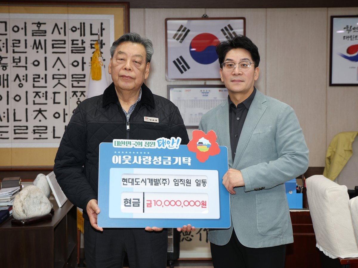 현대도시개발, 2일 태안군에 성금 1천만 원 전달 (태안군 제공) [PEDIEN] 현대도시개발이 태안군에 따뜻한 겨울나기를 위한 성금 1천만 원을 기탁했다. 태안기업도시 개발을 진행하며 지역사회와 꾸준히 소통하는 모습이다.지난 2일, 태안군청 군수실에서 가세로 군수와 현대도시개발 백정욱 대표 등이 참석한 가운데 성금 전달식이 진행됐다. 현대도시개발은 이번 기탁을 통해 2020년부터 올해까지 5년간 총 8911만 원의 성금을 태안군에 전달하며 지역사회에 대한 지속적인 관심을 보여줬다.백정욱 대표는 “겨울철 어려움을 겪는 이웃들에게 조금이나마 도움을 주고 싶다는 임직원들의 마음을 모아 성금을 기탁하게 됐다”고 밝혔다. 이어 “앞으로도 태안군의 발전을 위해 노력하는 기업이 되겠다”는 의지를 전했다.현대도시개발의 꾸준한 기부는 지역사회에 훈훈함을 더하고 있다. 태안군은 현대도시개발의 따뜻한 나눔에 감사를 표하며, 앞으로도 지속적인 협력 관계를 기대한다고 밝혔다. -