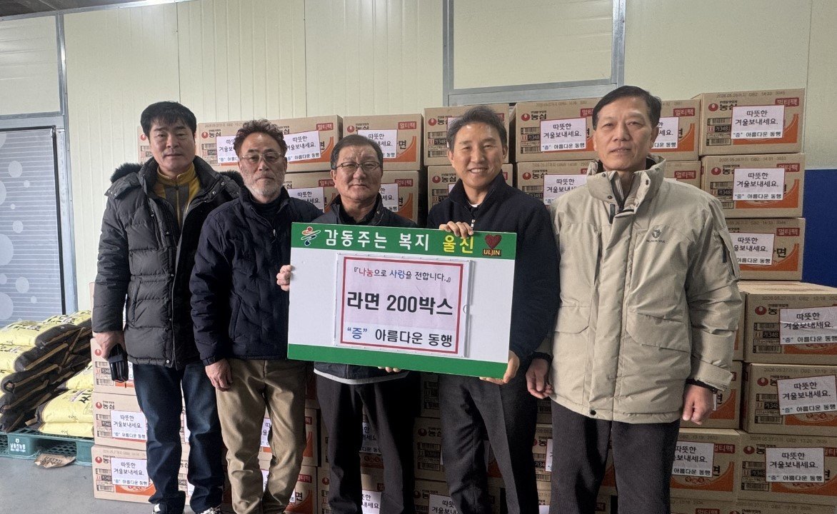 ‘아름다운 동행’죽변면에 라면 200박스 기탁 (울진군 제공) [PEDIEN] 아름다운 동행이 연말을 맞아 지난 12월 16일 울진군 죽변면 지역 취약계층을 위한 따뜻한 나눔을 실천했다.이날 아름다운 동행은 라면 200박스를 후원했으며, 해당 물품은 경제적 어려움을 겪고 있는 관내 취약계층을 대상으로 세대당 1박스씩 전달될 예정이다.아름다운 동행은 죽변 관내에서 사업체를 운영하고 있는 지역 사업자 약 35명으로 구성된 단체로 지역사회와 상생하는 나눔 활동을 꾸준히 이어오고 있다.앞으로도 지역사회와 함께하는 나눔 활동을 지속해 나갈 계획이다.신흥만 대표는 “추운 겨울을 보내는 이웃들에게 작은 도움이 되길 바라는 마음으로 후원을 결정했다”며“앞으로도 지역사회와 함께하는 나눔을 이어가겠다”라고 전했다.한만근 죽변면장은 “지역사회 나눔 문화 확산에 앞장서 주신 ‘아름다운 동행’에 깊이 감사드린다”며“후원 물품은 도움이 필요한 이웃들에게 소중히 전달하겠다”라고 말했다. -