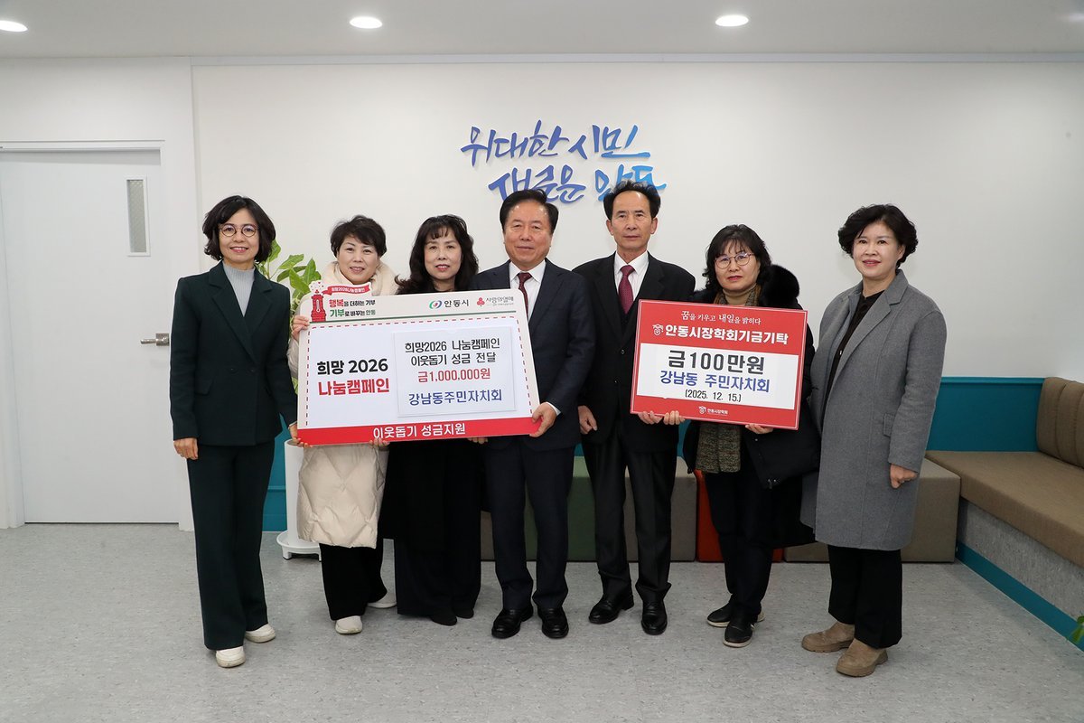 “사랑 100 + 희망 100 = 행복 200”강남동 주민자치회, 연말 이웃사랑․인재육성 성금 200만 원 기탁 (안동시 제공) [PEDIEN] 안동시 강남동 주민자치회가 연말연시를 맞아 어려운 이웃과 지역 인재를 위한 따뜻한 나눔을 실천하며 지역 사회에 훈훈함을 더하고 있다.강남동 주민자치회는 지난 12월 15일, 안동시청 시장실에서 관내 저소득층을 위한 성금 100만원과 안동시 장학기금 100만원, 총 200만원을 기탁했다.이번 기부는 고물가와 경기 침체로 힘든 겨울을 보내는 이웃들에게 온기를 전하고, 경제적 어려움으로 학업에 어려움을 겪는 학생들에게 희망을 주기 위해 마련되었다.특히 이번 성금은 강남동 주민자치회 위원들이 나눔 문화 확산에 솔선수범하자는 뜻을 모아 십시일반으로 마련했다는 점에서 더욱 의미가 깊다.기탁된 성금은 경북사회복지공동모금회를 통해 관내 저소득층 및 복지 사각지대 가구에 전달될 예정이며, 장학기금은 안동시장학회를 통해 지역 우수 인재 양성을 위한 장학 사업에 사용될 계획이다.서정학 강남동 주민자치회장은 작은 정성이지만 이웃들이 용기를 잃지 않고 따뜻한 겨울을 보내는 데 도움이 되길 바라며, 학생들이 안동을 빛낼 인재로 성장하는 밑거름이 되기를 희망한다고 밝혔다.또한 주민자치회는 앞으로도 주민의 삶 속으로 들어가 기쁨과 슬픔을 함께 나누며 살기 좋은 행복 강남동을 만드는 데 최선을 다할 것이라고 덧붙였다.권기창 안동시장은 어려운 시기임에도 이웃사랑과 인재 육성이라는 두 가지 가치를 실천한 강남동 주민자치회에 감사를 표하며, 기탁된 성금을 소중하게 사용하여 필요한 곳에 투명하고 공정하게 전달하겠다고 약속했다.한편 강남동 주민자치회는 깨끗한 마을 가꾸기 환경정화 활동, 주민 화합 한마당 개최, 이웃사랑 한 끼 나눔 행사 등 다양한 활동을 통해 풀뿌리 민주주의 정착과 지역 공동체 활성화에 기여하고 있다는 평가를 받고 있다. -