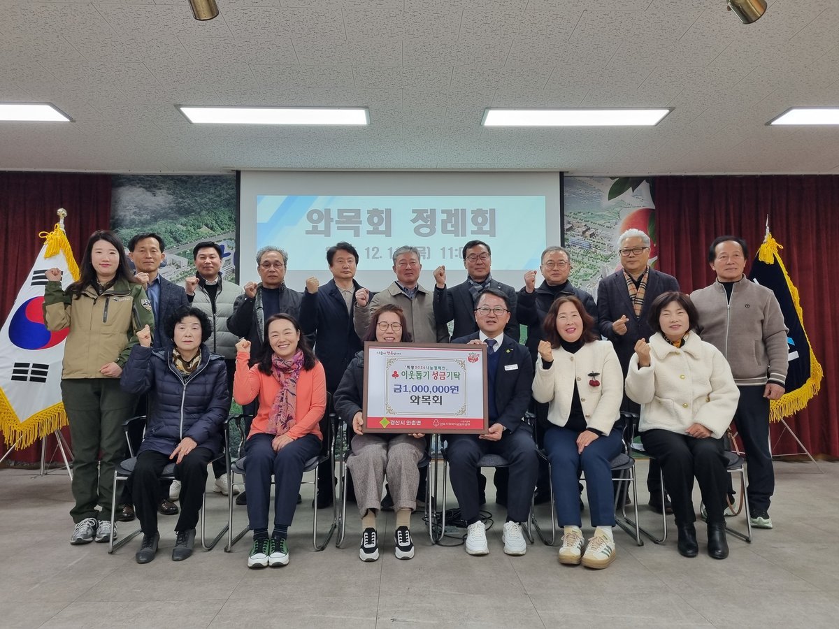 와촌면 와목회, 이웃돕기 성금 100만 원 기탁 (경산시 제공) [PEDIEN] 와촌면의 와목회가 추운 겨울, 어려움을 겪는 이웃들을 위해 따뜻한 나눔을 실천했다.와목회는 정기 회의를 마친 후, 지역 사회의 어려운 이웃을 돕기 위한 성금 100만원을 와촌면행정복지센터에 기탁했다고 11일 밝혔다.와목회 회원들은 작은 정성이지만 지역 사회에 도움이 되기를 바라는 마음으로 뜻을 모았다고 전했다. 이들은 이번 기탁이 지역 사회의 나눔 문화를 더욱 확산하는 계기가 되기를 희망한다고 덧붙였다.민중기 와촌면장은 지역 사회를 위한 따뜻한 관심과 나눔을 실천해 준 와목회 회원들에게 감사를 표했다. 그는 기탁된 성금이 한파와 경제적 어려움으로 힘든 시기를 겪는 지역 주민들에게 잘 전달될 수 있도록 하겠다고 약속했다.한편, 와목회는 와촌면 내 주요 기관 단체장 32명이 모여 지역 현안을 논의하는 주민 자치 기구다. 주민 복지, 지역 개발, 환경 문제 등 다양한 분야에서 지역 주민과 행정기관의 소통 창구 역할을 수행하며, 격월 목요일마다 정기 회의를 개최하고 있다. -