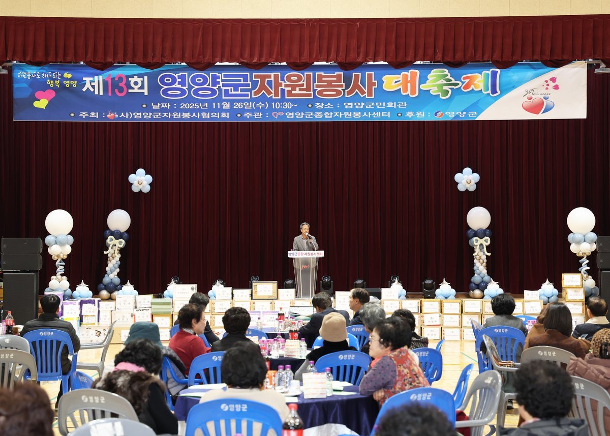 영양군종합자원봉사센터, 제13회 영양군 자원봉사대축제 개최 (영양군 제공) [PEDIEN] 영양군종합자원봉사센터가 지난 26일 영양군민회관에서 '제13회 영양군 자원봉사 대축제'를 개최했다.이날 행사에는 지역 내 자원봉사자 200여 명이 참석하여 자리를 빛냈다.이번 축제는 한 해 동안 묵묵히 봉사활동을 펼치며 지역사회 발전에 이바지한 자원봉사자들의 노고에 감사하고, 서로 소통하며 화합을 다지는 의미있는 시간으로 꾸며졌다.행사는 1부와 2부로 나뉘어 진행되었으며, 1부에서는 자원봉사 유공자 표창이 있었다. 군수 표창을 포함한 총 8개 부문에서 10명의 자원봉사자가 수상의 영예를 안았다.2부에서는 축하 공연과 경품 추첨 등 다채로운 프로그램이 진행되어 참석자들의 큰 호응을 얻었다.김길동 영양군종합자원봉사센터장은 “이번 대축제가 자원봉사자들이 자긍심을 느끼는 계기가 되기를 바란다”며, “앞으로도 자원봉사 문화가 더욱 확산될 수 있도록 노력하겠다”고 밝혔다.오도창 영양군수는 “지역사회를 위해 헌신한 자원봉사자들에게 깊이 감사드린다”며, “자원봉사 활성화를 위한 지원을 아끼지 않겠다”고 약속했다. -