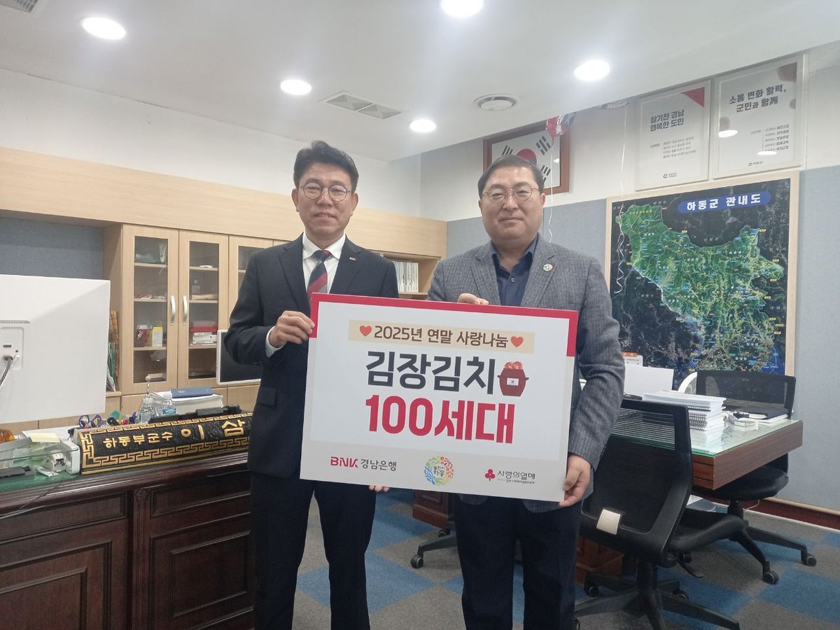 경남은행 하동지점, 김장김치 100박스 기탁 (하동군 제공) [PEDIEN] 경남은행 하동지점이 지난 26일, 하동군 내 어려운 이웃들을 위해 김장김치 100박스를 기탁하며 훈훈한 나눔을 실천했다.약 400만원 상당의 김장김치는 겨울철 식료품 구매에 어려움을 겪는 취약계층에게 전달될 예정이다. 경남은행은 해마다 지역사회를 위한 후원 활동을 꾸준히 이어오고 있다.이번 김장김치 지원은 난방비와 생계비 부담으로 힘든 겨울을 보내는 독거노인 및 복지 사각지대 가구에 실질적인 도움을 주기 위해 마련됐다.김찬규 경남은행 하동지점장은 “어려운 이웃들이 따뜻한 겨울을 보내는 데 조금이나마 보탬이 되기를 바란다”며 지속적인 나눔 실천을 약속했다.하승철 하동군수는 경남은행의 꾸준한 나눔에 감사를 표하며, 전달된 김치를 통해 주민들이 따뜻한 겨울을 보낼 수 있도록 노력하겠다고 밝혔다.하동군은 앞으로도 민관 협력을 강화하여 복지 사각지대 해소를 위한 다양한 지원을 확대해 나갈 계획이다. 경남은행의 따뜻한 나눔이 지역사회에 훈훈한 온기를 불어넣고 있다. -