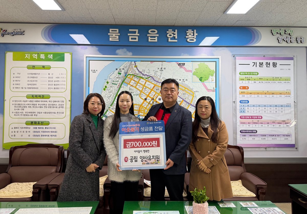 공립 양산유치원, 물금읍에 연말 이웃돕기 성금 전달 (양산시 제공) [PEDIEN] 양산시 물금읍에 위치한 공립 양산유치원이 연말을 맞아 따뜻한 나눔을 실천했다.양산유치원은 학부모회와 아이들이 함께 아나바다 행사를 통해 얻은 수익금 70만원을 물금읍 행정복지센터에 기탁하며 지역사회에 온정을 전했다.이번 기탁은 아이들이 직접 참여하는 나눔 활동이라는 점에서 더욱 의미가 깊다.학부모회는 아이들과 함께 물건을 나누고 판매하는 과정을 통해 얻은 수익금을 어려운 이웃을 돕는 데 사용하기로 결정했다.정현 학부모회장은 아나바다 행사를 통해 마련된 기금을 기부하게 되어 기쁘다는 소감을 밝혔다.더불어 내년에도 지속적인 기부활동을 통해 나눔 문화를 확산시켜 나가겠다는 의지를 표명했다.심주석 물금읍장은 양산유치원의 따뜻한 마음에 감사를 표하며, 기탁금은 물금읍 지역사회보장협의체를 통해 지역 내 저소득 취약계층을 위한 특화사업에 사용될 예정이라고 밝혔다.이번 양산유치원의 나눔 활동은 아이들에게 나눔의 가치를 배우고 실천하는 소중한 경험을 제공하는 동시에, 지역사회에 따뜻한 온정을 전하는 계기가 될 것으로 기대된다. -