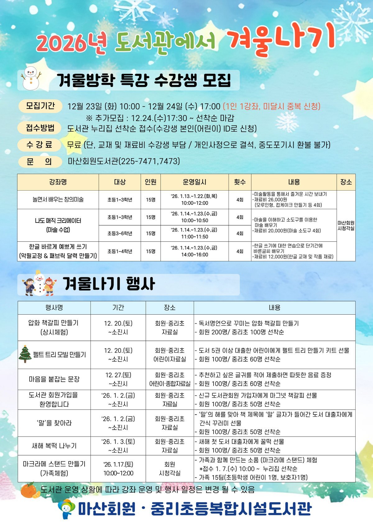 창원특례시 시립 공공도서관 ‘겨울방학 맞이 프로그램’운영 내년 1월 한 달간 어린이 대상 독서교실 및 방학특강 실시