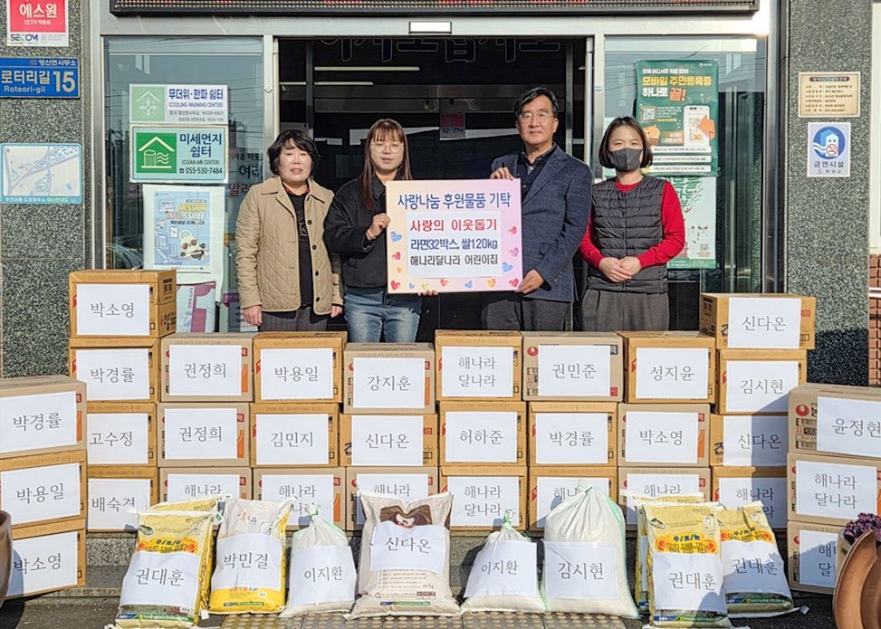 해나라달나라 어린이집, 쌀 120kg·라면 32박스 영산면 기탁 (창녕군 제공) [PEDIEN] 해나라달나라 어린이집이 지난 16일, 영산면에 쌀 120kg과 라면 32박스를 기탁하며 따뜻한 나눔을 실천했다.이번 기탁은 어린이집 원생들과 교직원들이 함께 마음을 모아 마련한 것으로 알려졌다. 해마다 꾸준히 이어져 오는 해나라달나라 어린이집의 대표적인 나눔 활동 중 하나다.권정희 원장은 아이들이 나눔을 통해 자연스럽게 이웃을 생각하는 마음을 키우기를 바란다고 전했다. 또한 정성껏 준비한 물품이 어려운 이웃들이 따뜻하게 겨울을 나는 데 조금이나마 도움이 되기를 희망한다고 밝혔다.하회근 영산면장은 해나라달나라 어린이집 가족 모두의 따뜻한 마음에 감사를 표했다. 아이들의 소중한 마음이 필요한 곳에 잘 전달될 수 있도록 최선을 다하겠다고 약속했다.해나라달나라 어린이집의 꾸준한 나눔 활동은 아이들에게 나눔의 가치를 배우게 하고, 지역사회에 따뜻한 온정을 불어넣는 긍정적인 영향을 미칠 것으로 기대된다. -