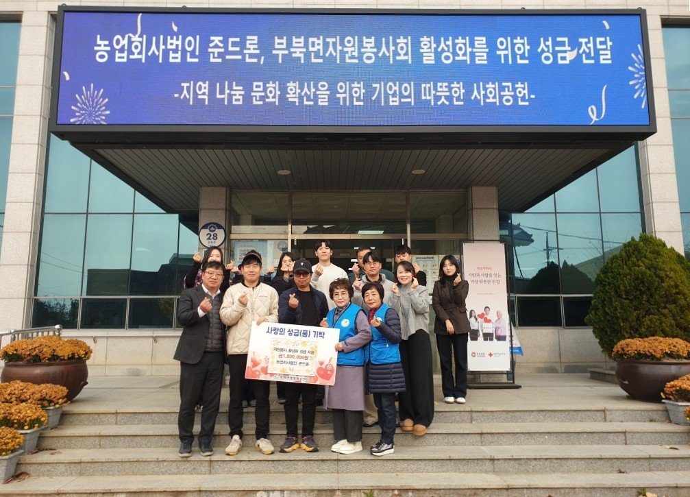 농업회사법인 준드론, 부북면 자원봉사회에 성금 전달 (밀양시 제공) [PEDIEN] 농업회사법인 준드론이 부북면 자원봉사회의 활동 지원을 위해 100만원의 성금을 기탁했다.이번 기부는 준드론 김범준 대표의 뜻에 따라 부북면 자원봉사회의 운영 및 활동 기반을 강화하고자 마련됐다. 부북면 자원봉사회는 지역 내 소외된 이웃을 위한 다양한 봉사활동을 펼치고 있다.이무경 부북면 자원봉사회 회장은 이번 기부를 통해 회원들의 봉사 참여가 더욱 활발해질 것으로 기대하며, 앞으로도 취약계층 복지 향상에 기여하는 단체가 되겠다고 밝혔다.김범준 대표는 평소 나눔을 실천하는 자원봉사회의 활동에 힘을 보탤 수 있어 기쁘다며, 앞으로도 지역사회와 함께 성장하는 기업이 되겠다고 약속했다.박영훈 부북면장은 준드론 김범준 대표에게 감사를 표하며, 기탁된 성금은 부북면 자원봉사 활성화 사업에 소중하게 사용될 예정이라고 전했다. -