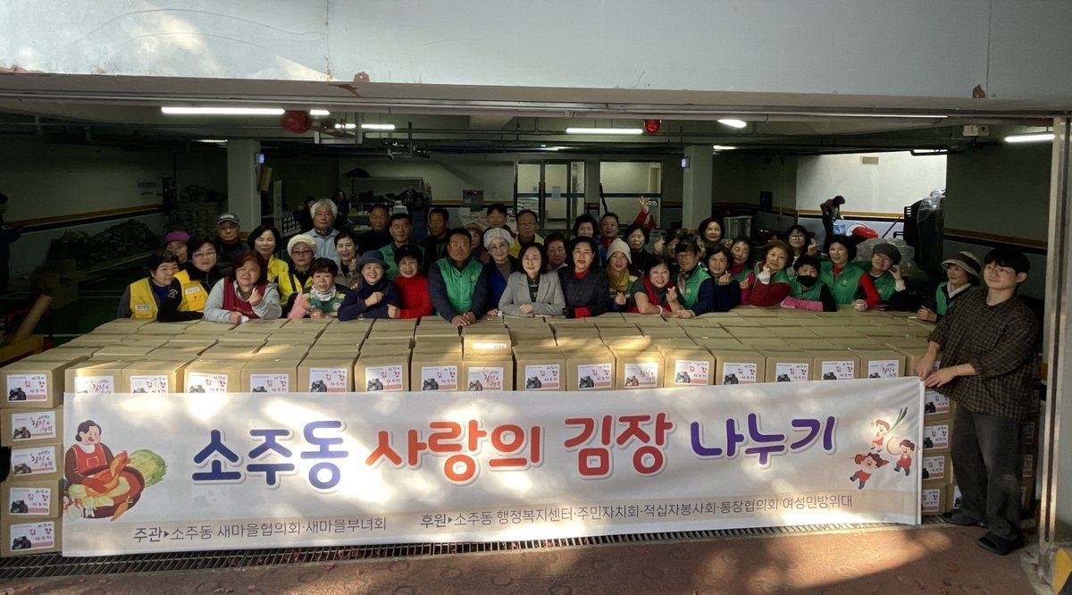 소주동 사랑의 김장나누기 행사 (양산시 제공) [PEDIEN] 소주동 새마을 부녀회은 지난 11월 24일~25일 이틀동안 소주동 관내 저소득층 등 취약계층을 위한 사랑의 김장나누기 행사를 진행하였다.이번 김장나누기 행사는 소주동 새마을부녀회‧협의회를 중심으로 통장협의회, 행정복지센터 직원, 주민자치회, 적십자 봉사회, 체육회 등 소주동 소재 유관기관 및 단체가 참여하였으며, 김장김치 430여 박스를 마련하여 관내 도움이 필요한 취약계층 가구에 전달하였다.장세란 새마을부녀회장은 “추운 겨울이 다가올수록 취약계층에 대한 관심이 더 필요하다”고 말하며 “소소한 김치 한통이지만 필요한 이웃들이 맛있게 드셔주시고, 김장나누기 행사에 참여하고 도움을 주신 부녀회장님들과 관계자분들께 감사드린다.”고 전했다.이순재 소주동장은“이번 나눔을 통해 소외되고 취약한 이웃들이 따뜻한 정을 느낄 것으로 본다.”면서 “앞으로도 도움이 필요한 가구를 발굴하고 나눔의 손길이 전달될 수 있도록 힘쓰겠다.”고 밝혔다. -
