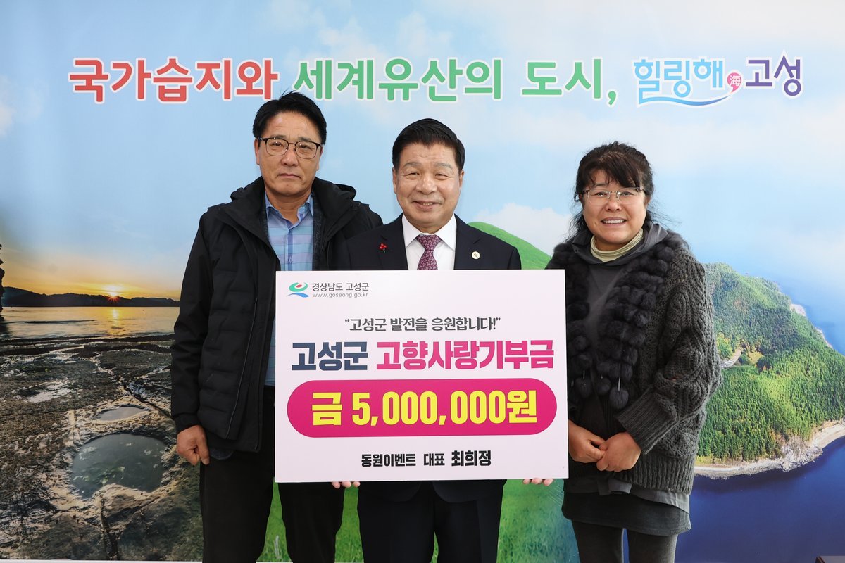 동원이벤트 대표 최희정, 고향 고성에 고향사랑기부금 500만 원 기탁! (경남고성군 제공) [PEDIEN] 이벤트·행사 대행업체 동원이벤트의 최희정 대표가 지난 12월 17일, 고향인 고성군에 고향사랑기부금 500만원을 기탁했다.최 대표는 고성에서 태어나고 자란 인연을 소중히 여기며 기부를 결심했다고 밝혔다. 그는 앞으로도 고성에 대한 지속적인 관심을 갖고 지역사회에 도움이 될 수 있는 다양한 방안을 모색할 계획이라고 덧붙였다.김종춘 고성군 인구청년추진단장은 최 대표의 깊은 애정과 나눔에 감사를 표했다. 기탁금은 군민의 삶의 질 향상과 지역 발전을 위한 소중한 재원으로 활용될 예정이다.고향사랑기부제는 개인이 주소지 외 다른 지자체에 기부하는 제도다. 기부금은 세액공제 혜택과 함께 답례품을 받을 수 있어, 고성군은 답례품 종류를 확대하고 특색있는 상품을 발굴하여 기부제 활성화에 노력하고 있다.이번 최희정 대표의 기부는 고향사랑기부제가 지역사회 발전에 기여하는 좋은 사례로 평가받고 있다. -