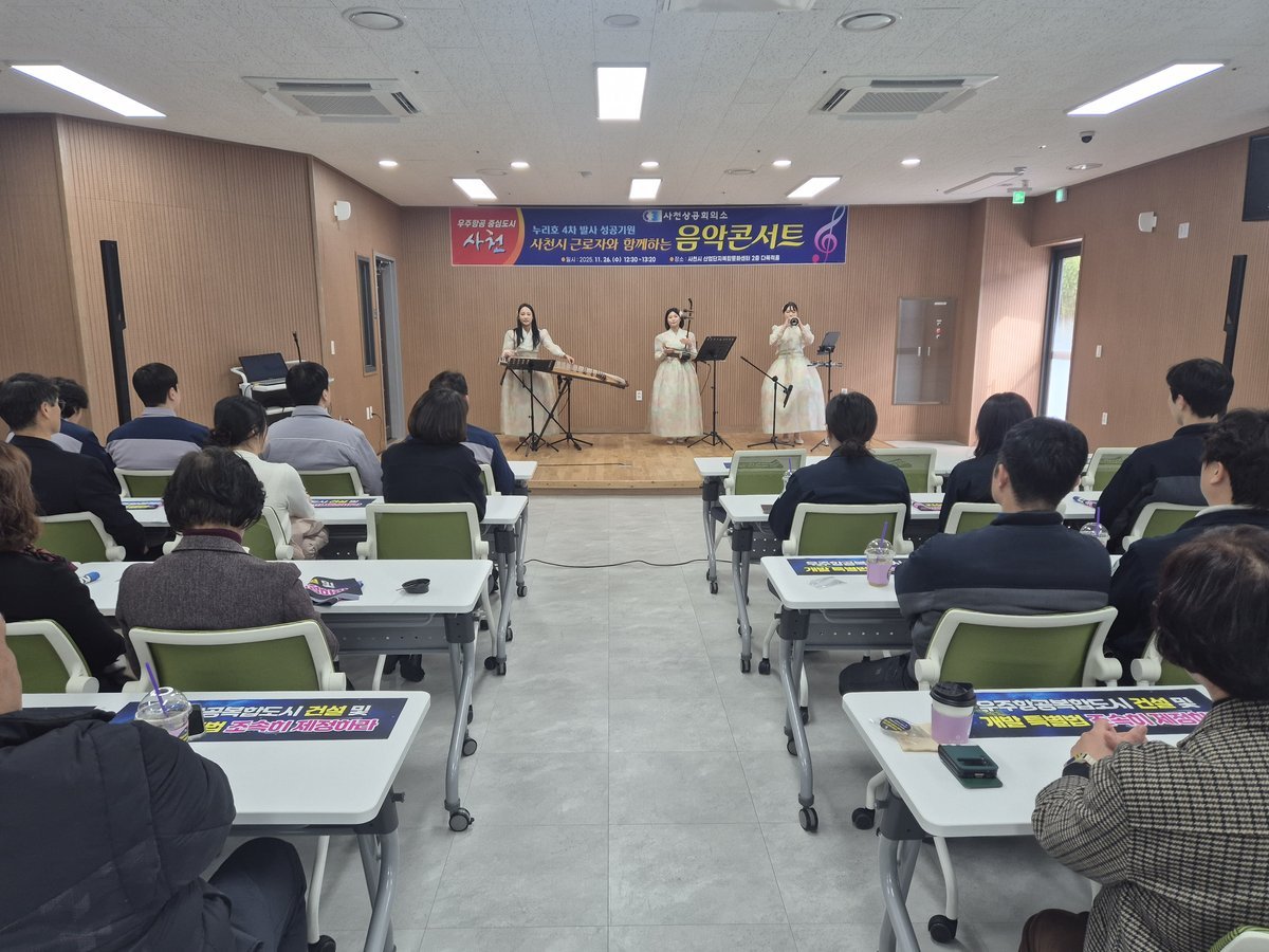 [PEDIEN] 사천상공회의소가 누리호 4차 발사의 성공을 기원하며 사천시 근로자들을 위한 특별한 음악 콘서트를 개최했다.지난 26일 사천시산업단지복합문화센터에서 열린 이번 행사는 다채로운 공연과 풍성한 경품으로 근로자들의 뜨거운 호응을 얻었다.콘서트는 국악, 뮤지컬, 대중음악이 어우러진 풍성한 무대로 꾸며졌다. 영화 '스타워즈' 메인 테마의 국악 연주를 시작으로 태평소, 가야금, 해금 등 국악기 소개가 이어졌다. 또한 '아로하' 듀엣, '보랏빛 향기' 여성 솔로, '붉은 노을' 남성 솔로 등 다양한 공연이 펼쳐지며 관객들에게 즐거움을 선사했다.특히 챗GPT를 활용한 디지털 행운권 추첨은 행사 분위기를 더욱 고조시켰다. 농협사천시지부, 한국산업단지공단 경남서부지사, 대호골프랜드, 성일산업 등 지역 기관과 기업들이 쌀, 보조배터리, 골프장 이용권, 지역 특산품 등 푸짐한 경품을 협찬하여 근로자들에게 풍성한 선물을 제공했다.황태부 사천상공회의소 회장은 “오늘 음악 콘서트가 사천시 근로자들의 열정과 헌신을 응원하고 대한민국 우주항공산업의 미래를 함께 그려보는 소중한 자리가 되기를 바란다”며 “누리호 4차 발사의 성공을 기원하며 사천시가 진정한 우주항공 수도로 도약하는 날을 함께 기대한다”고 말했다.박동식 사천시장은 영상 메시지를 통해 근로자들의 노고에 감사를 표하며 누리호 발사의 성공을 기원했다. 행사는 근로자들의 땀과 열정이 대한민국 산업의 버팀목이자 사천의 미래를 밝히는 가장 큰 힘이라는 메시지와 함께 마무리됐다. 참석자들은 기념품과 행운 물품을 받으며 따뜻한 격려 속에 귀가했다.