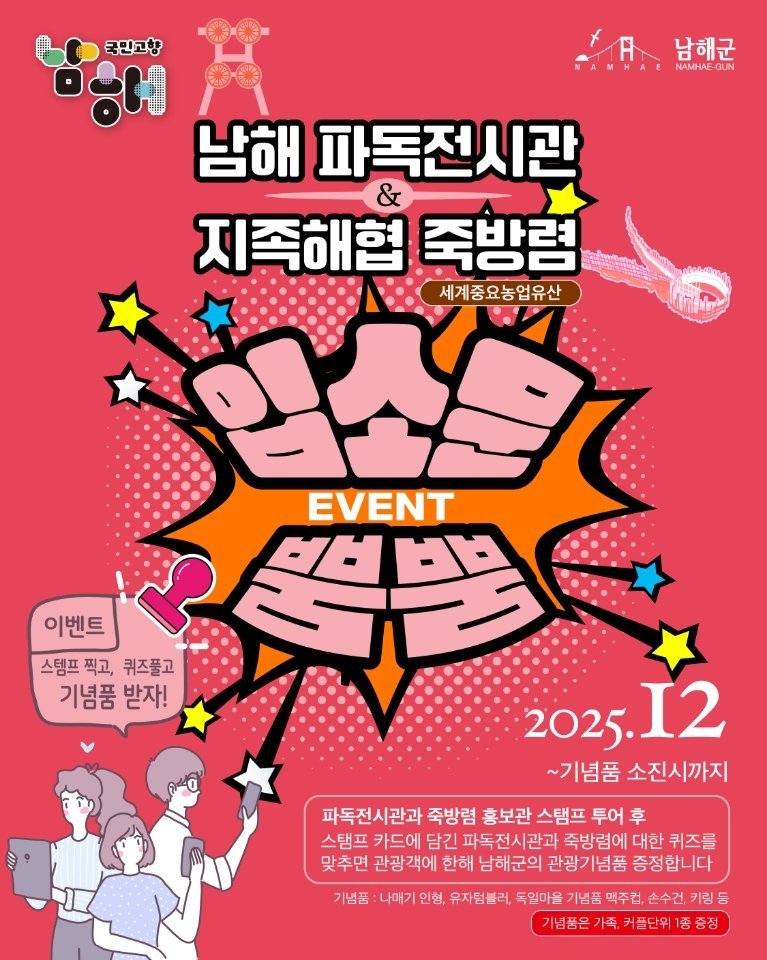 [PEDIEN] 남해군이 파독전시관과 죽방렴 홍보관을 연계한 특별한 이벤트를 개최하며 관광객 유치에 나선다.이번 이벤트는 세계중요농업유산으로 등재된 지족해협 죽방렴의 가치를 널리 알리고, 남해군을 찾는 방문객들에게 특별한 경험을 제공하기 위해 기획됐다.참여 방법은 간단하다. 파독전시관과 죽방렴 홍보관 두 곳을 모두 방문한 후 퀴즈에 참여하면 된다. 정답을 맞힌 참가자에게는 남해군의 특색이 담긴 기념품이 제공된다.기념품은 나매기 인형, 유자 텀블러, 독일마을 기념 맥주잔 등 다채로운 품목으로 구성되어 있어 남해군을 방문한 기념으로 간직하기에 충분하다.남해군 관계자는 이번 이벤트를 통해 파독 광부와 간호사들의 역사와 세계중요농업유산인 죽방렴을 널리 알리고, 더 많은 관광객이 남해군을 찾도록 노력하겠다고 밝혔다.