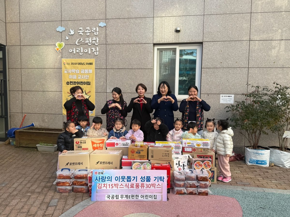 국공립 무계E편한어린이집장유1동에 작은손으로 만든 사랑 나눔 (김해시 제공) [PEDIEN] 김해시 장유1동에 위치한 국공립 무계E편한어린이집이 김장철을 맞아 원생들과 학부모가 함께 정성껏 마련한 김치와 식료품을 지역사회에 기탁하며 훈훈한 나눔을 실천했다.지난 11일, 무계E편한어린이집 원생들은 작은 손으로 직접 담근 김치 15통을 준비했다. 학부모들은 십시일반 정성을 모아 식료품 30박스를 후원하며 나눔에 힘을 보탰다.무계E편한세상 2차 아파트 단지 내에 자리 잡은 이 어린이집은 안전한 시설과 체계적인 보육 환경을 자랑한다. 전문 교직원들은 아이들의 건강한 성장을 위해 끊임없이 노력하고 있다.특히, 무계E편한어린이집은 매년 김장 김치 나눔 행사를 통해 아이들에게 나눔의 가치를 가르치고 지역사회에 따뜻한 온정을 전하고 있다.이수진 원장은 "아이들이 김장 활동을 통해 성취감을 느끼고 나눔의 기쁨을 깨닫기를 바란다"며 "아이들의 정성이 담긴 김치가 어려운 이웃들에게 따뜻하게 전달되기를 희망한다"고 밝혔다.이삼주 장유1동장은 "매년 잊지 않고 나눔을 실천하는 무계E편한어린이집에 깊이 감사드린다"며 "아이들의 따뜻한 마음이 담긴 김치와 식료품은 꼭 필요한 이웃들에게 소중히 전달하겠다"고 약속했다. -