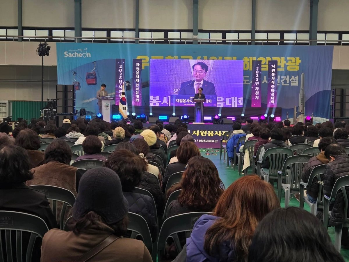 사천시자원봉사단체협의회,「2025년 자원봉사자 한마음대회」 개최 (사천시 제공) [PEDIEN] 사천시자원봉사단체협의회가 지난 11일 삼천포체육관에서 '2025년 자원봉사자 한마음대회'를 개최했다.이날 행사는 한 해 동안 지역사회 곳곳에서 헌신적인 봉사활동을 펼쳐온 자원봉사자들의 노고를 격려하고, 화합을 다지는 자리로 마련됐다. 읍면동 및 기업·사회단체 봉사자 300여 명이 참석하여 의미를 더했다.행사는 사천시자원봉사센터 소속 '소리나래 봉사단'의 우쿨렐레 공연과 '나눔은 댄스를 타고' 봉사단의 라인댄스 공연으로 시작을 알렸다. 이어진 1부 기념식에서는 우수 자원봉사단체와 개인에 대한 시장 표창이 수여됐다.특히 기념식에서는 우주항공복합도시 조성을 위한 특별법의 조속한 제정을 촉구하는 캠페인이 펼쳐져 눈길을 끌었다. 자원봉사자들은 사천시의 미래 발전에 대한 염원을 담아 한 목소리를 냈다.2부에서는 '숟가락 난타 봉사단'과 지역 가수 '삼각지기 봉사단'의 축하공연이 분위기를 고조시켰다. 명랑운동회를 통해 봉사자들은 함께 웃고 즐기며 재충전하는 시간을 가졌다.박동식 사천시장은 자원봉사자들의 헌신에 감사를 표하며, 이들의 노력이 사천시를 '행복도시'이자 '미래 우주항공도시'로 발전시키는 데 큰 힘이 될 것이라고 강조했다.양경옥 협의회장은 어려운 이웃을 위해 묵묵히 봉사해 온 모든 자원봉사자들에게 존경과 감사의 마음을 전했다. 또한 각자의 자리에서 사천시를 밝히는 소중한 존재가 되어주기를 바란다고 덧붙였다. -