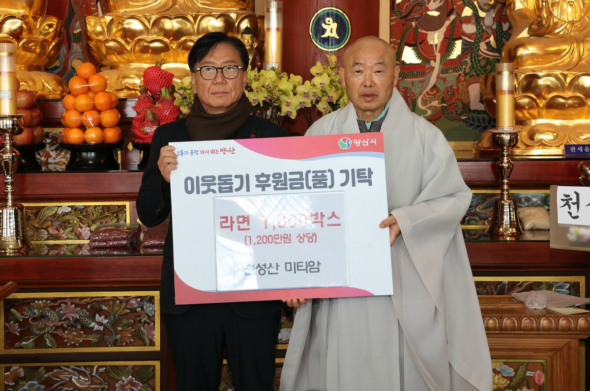 천성산 미타암, 웅상출장소에 라면 1000박스 기탁 (양산시 제공) [PEDIEN] 천성산 미타암이 웅상 지역의 어려운 이웃을 위해 라면 1000박스를 웅상출장소에 기탁했다.미타암은 지난 9일 공양간 준공을 기념하여 이번 기부를 진행했으며, 웅상 지역의 소외된 이웃들에게 따뜻한 마음을 전달하고자 했다.미타암의 이번 라면 기부는 단순한 물품 전달을 넘어, 지역사회와의 소통과 화합을 중시하는 미타암의 사회공헌 활동의 일환으로 평가받는다. 평소 지역 주민들과의 유대감을 중요하게 생각하는 미타암은 이번 기부를 통해 지역사회에 훈훈한 나눔 문화를 확산시키는 데 기여하고 있다.새롭게 준공된 공양간은 미타암 신도들뿐만 아니라 지역 주민들도 함께 이용할 수 있는 공간으로 조성되어 공동체 의식을 함양하는 데 목적을 두고 있다. 미타암은 이 공간을 통해 더욱 활발한 사회공헌 활동을 펼치고, 지역 화합의 중심지로서의 역할을 수행할 것으로 기대된다.미타암 주지 동진스님은 공양간 준공까지 도움을 준 많은 이들에게 감사의 마음을 전하며, 어려운 이웃들과 함께 나누고자 이번 기부를 결정했다고 밝혔다. 또한, 앞으로도 종교 본연의 역할을 충실히 수행하며 지역사회를 위한 기부 활동을 지속적으로 이어나갈 것을 약속했다.오상호 웅상출장소장은 미타암의 지속적인 기부에 감사를 표하며, 기탁된 라면은 도움이 필요한 이웃들에게 소중하게 전달될 것이라고 말했다. -