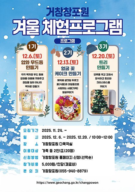 거창창포원, 신나는 겨울 체험프로그램 운영 시작 (거창군 제공) [PEDIEN] 거창창포원이 다음 달 6일부터 방문자센터와 열대식물원에서 다채로운 겨울 체험 프로그램을 운영하며 방문객들에게 특별한 추억을 선사할 예정이다.이번 프로그램은 사계절 체험프로그램과 정원 프로그램 활성화를 위해 마련됐다.방문자센터에서는 압화 무드등 만들기, 얼굴 꽃 케이크 만들기, 트리 만들기 등 가족 단위 방문객을 위한 체험 프로그램이 진행된다. 12월 6일부터 20일까지 매주 토요일, 2인 1조로 총 3회 운영될 계획이다.열대식물원에서는 12월 6일부터 내년 1월 31일까지 크리스마스 분위기를 가득 담은 ‘산타 가든’이 운영된다.방문객들은 아름다운 장식과 다양한 식물이 어우러진 공간에서 특별한 겨울 정취를 자유롭게 만끽할 수 있다.이번 겨울 체험 프로그램은 가족과 함께 거창창포원에서 잊지 못할 겨울 추억을 만들 수 있는 좋은 기회가 될 것으로 기대된다. -