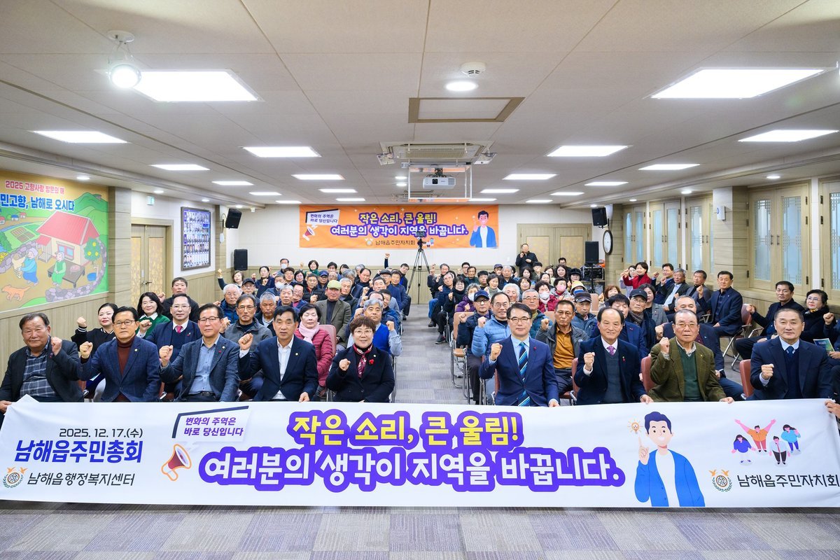 2025년 남해읍 주민총회 성황리 개최 (남해군 제공) [PEDIEN] 남해읍 주민들이 직접 2026년 추진할 주민자치 사업의 우선순위를 결정하는 주민총회가 17일 남해읍행정복지센터에서 성황리에 개최됐다.이번 총회에는 군수, 군의장, 도·군의원 등 주요 인사와 주민자치회 위원, 이장단, 읍민 등 100여 명이 참석하여 자리를 빛냈다. 참석자들은 2025년 주민자치회의 활동 성과를 공유하고, 다가오는 2026년 사업 계획을 논의하며 지역 발전에 대한 열띤 토론을 벌였다.총회는 경기민요 공연과 피아노·바이올린 협주로 시작되어 흥겨운 분위기를 고조시켰다. 이어 주민자치 활성화에 기여한 공로자들에 대한 표창이 진행되었다. 박철영 사무국장과 임미애 위원은 지역 주민자치 발전과 공동체 활성화에 헌신한 공로를 인정받아 공로패를 수상하는 영예를 안았다.남해읍 주민자치회는 올해 청정남해 환경정화 활동, 봄꽃 소화단 조성, 남해포차 행사 공동 개최 등 다양한 사업을 추진했다. 특히, 고향사랑 방문의 해를 맞아 타 지역 주민자치회와의 교류를 통해 협력 네트워크를 확장하는 데 힘썼다.총회에서는 2026년 추진 예정인 5건의 주민자치 사업에 대한 설명과 함께 주민 투표가 진행되었다. 투표 결과, 우리 동네 종합 안내판 제작, 쥐·해충 차단 우수관 철망 설치, 마을 유휴지 4계절 꽃밭 조성, 우리 동네 친환경 프로젝트, 다 같이 돌자 동네 한바퀴 순으로 우선순위가 결정되었다.하희택 회장은 “주민총회는 주민이 직접 지역의 미래를 결정하는 중요한 자리”라며, “앞으로도 주민들의 적극적인 참여를 바탕으로 살기 좋은 남해읍을 만들어나가기 위해 최선을 다하겠다”고 밝혔다. 이번 주민총회를 통해 남해읍은 주민 주도의 자치 역량을 강화하고, 지역 발전을 위한 새로운 동력을 얻을 것으로 기대된다. -