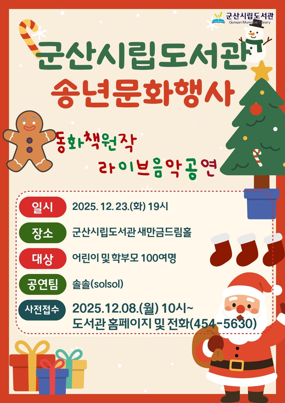 ‘책으로 마무리하는 한 해’군산시 도서관 12월 특별 프로그램 선보여 (군산시 제공) [PEDIEN] 군산시가 연말을 맞아 시민들이 책과 함께 한 해를 마무리하도록 12월 한 달간 다채로운 연말 특별 프로그램을 운영한다.먼저 연말을 맞아 군산시의 모든 공공 도서관에서는 ‘두배로 대출’프로그램을 선보인다.‘두배로 대출’프로그램은 12월 동안 도서 대출 권수를 기존 1인당 5권에서 최대 10권으로 확대하여 시민들이 책과 함께 연말을 보낼 수 있도록 하는 행사다.각 도서관마다 다채로운 특별 프로그램도 준비됐다.금강도서관은 책에 깊이 몰입하고 싶은 성인 30명을 대상으로 12월 11일까지 사이 3일 3시간 동안 ‘독서야 행 ’을 준비해, 연말의 분주함 속에서 나만의 조용한 독서 시간을 확보해 깊이 있는 독서를 즐길 수 있도록 배려할 예정이다.또한, ‘크리스마스 북큐레이션’을 통해 사서 추천 도서를 전시하고 △관련 도서들의 책꾸러미 대출 △크리스마스 트리 카드 만들기 △크리스마스 특별 영화상영 등의 체험형 행사도 연다.늘푸른도서관은 가족 단위 관람객의 눈높이에 맞춘 특별 인형극으로 연말 분위기를 더한다.9일에 선보이는「크리스마스의 종소리 공연」은 산타와 캐롤 음악이 함께하는 가족 인형극으로 아이들에게 잊지 못할 따뜻한 추억을 선사할 예정이다.산들도서관은 시민들이 직접 참여하고 즐기는 체험형 프로그램에 집중한다.12월 한 달 동안 ‘크리스마스 종이 놀이터’, ‘두둥실 풍선공방’등 겨울 맞이 만들기 체험과 ‘그림책 연계 독후활동’을 운영할 계획이다.회현작은도서관은 20일에 손인형과 탈인형이 등장하는 퓨전 인형극 「빨간코 루돌프와 산타클로스」를 개최한다.빨간코의 루돌프가 산타클로스의 썰매를 타는 줄거리를 통해 아이들은 자신의 가치를 인정하고 자존감을 높이며, 서로 협력함으로써 성취감을 느끼는 시간이 될 것으로 기대된다.이외에도 7개 작은도서관에서는 성인 대상으로 ‘성탄 리스&캔들 만들기’와 어린이 대상으로 ‘나만의 미니 트리 만들기’프로그램이 각각 진행되며, 자세한 일정은 군산시립도서관 누리집을 통해 확인할 수 있다.마지막으로 군산시립도서관 본관에서는 크리스마스 주간인 23일에 어린이와 보호자 100명을 대상으로 라이브 음악과 동화 구연이 결합된「동화 작은 음악회」공연을 개최하여, 연말의 따뜻함을 전달할 예정이다.아울러 12월 한 달간 ‘함께 나누고 싶은 순간’트리에 추천 책과 사유를 전시하는 현장 참여 행사와 책의 내용을 알 수 없는 채로 대출하는 ‘블라인드 북데이트’를 운영하여 시민들이 새로운 책을 접하는 신선한 즐거움을 선사할 예정이다.군산시 도서관 관계자는 “12월 한 달 동안 시민들이 책을 통해 따뜻한 위로와 행복한 추억을 쌓을 수 있도록 다양한 프로그램을 마련했다.”라며, “책이 주는 위로와 이야기의 힘으로 한 해를 차분히 돌아보고, 새로운 마음으로 다가올 새해를 맞이하길 바란다.”라고 전했다. -