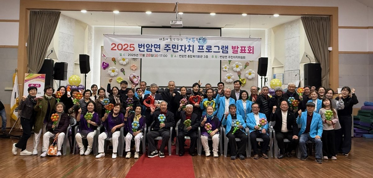 장수군 번암면 주민자치프로그램 발표회 성황리 개최 (장수군 제공) [PEDIEN] 장수군 번암면에서 주민들이 직접 참여하고 만들어가는 주민자치 프로그램 발표회가 성황리에 개최됐다. 이번 발표회는 주민들이 한 해 동안 갈고닦은 실력을 뽐내고, 지역 공동체의 화합을 다지는 자리로 마련됐다.종합복지회관에서 열린 이번 행사에서는 다양한 공연과 전시가 펼쳐졌다. 힐링토탈공예팀과 한글교실 수강생들의 작품 전시 공간이 마련되어 눈길을 끌었다. 또한, 주민들의 의견을 반영한 포토존이 새롭게 조성되어 큰 호응을 얻었다.행사는 파랑새중창단의 맑고 고운 노랫소리로 시작을 알렸다. 이후 난타, 오카리나 연주, 생활체조, 노래 교실 등 다채로운 공연이 이어졌다. 특히 어르신들의 노래 무대와 락밴드, 색소폰 연주는 행사 분위기를 최고조로 끌어올렸다.이향숙 주민자치위원장은 이번 발표회가 주민 간 소통의 장이 되었기를 바란다고 전했다. 덧붙여 주민들의 의견을 수렴하여 앞으로도 주민 중심의 다양한 프로그램을 운영할 계획이라고 밝혔다.이번 발표회는 주민들에게 문화 향유의 기회를 제공하고, 마을 공동체가 하나 되는 뜻깊은 시간이었다는 평가를 받았다.