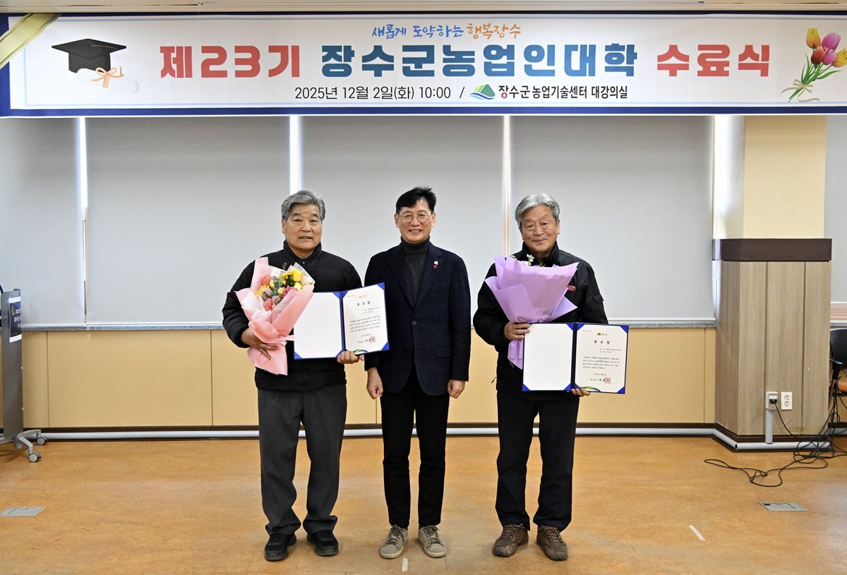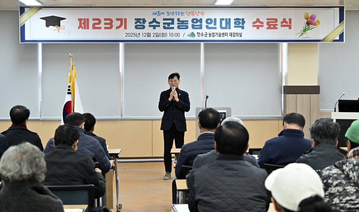 장수군 제23기 농업인대학 수료식 개최 (장수군 제공) [PEDIEN] 장수군이 농업기술센터에서 제23기 농업인대학 수료식을 개최했다. 최훈식 장수군수, 최한주 군의회 의장을 비롯해 80여 명의 수료생이 참석하여 자리를 빛냈다.올해 농업인대학은 지난 3월 개강하여 11월까지 운영되었다. 사과, 두릅, 지속가능한 치유농업 등 3개 과정으로 편성, 총 132명의 교육생이 참여했다.이론과 현장 실습을 병행한 37회, 175시간의 교육 과정을 통해 87명의 수료생을 배출하며 장수 농업을 이끌어갈 인재를 양성했다.수료식에서는 교육 운영에 기여한 백승덕 교육생이 공로상을 수상했다. 김연수, 김형중 교육생은 우수한 성적으로 전 과정을 이수하여 우수상을 받았다.농업인대학은 단순 기술 교육을 넘어 농업 경영 역량 강화에 실질적인 도움을 주었다는 평가를 받는다. 교육생들은 농업인대학에서 습득한 지식과 경험을 실제 농업 현장에 적용하여 고품질 농산물 생산과 효율적인 경영 관리에 도움이 될 것이라고 기대감을 나타냈다.최훈식 군수는 수료생들에게 축하를 전하며 앞으로도 농업인들에게 평생 학습 기회를 제공하고 지역 농업 발전에 필요한 현장 중심 프로그램을 지원하겠다고 밝혔다.장수군은 이번 농업인대학을 통해 배출된 전문 인력을 중심으로 지역 농업의 혁신과 발전을 적극적으로 추진할 계획이다. -