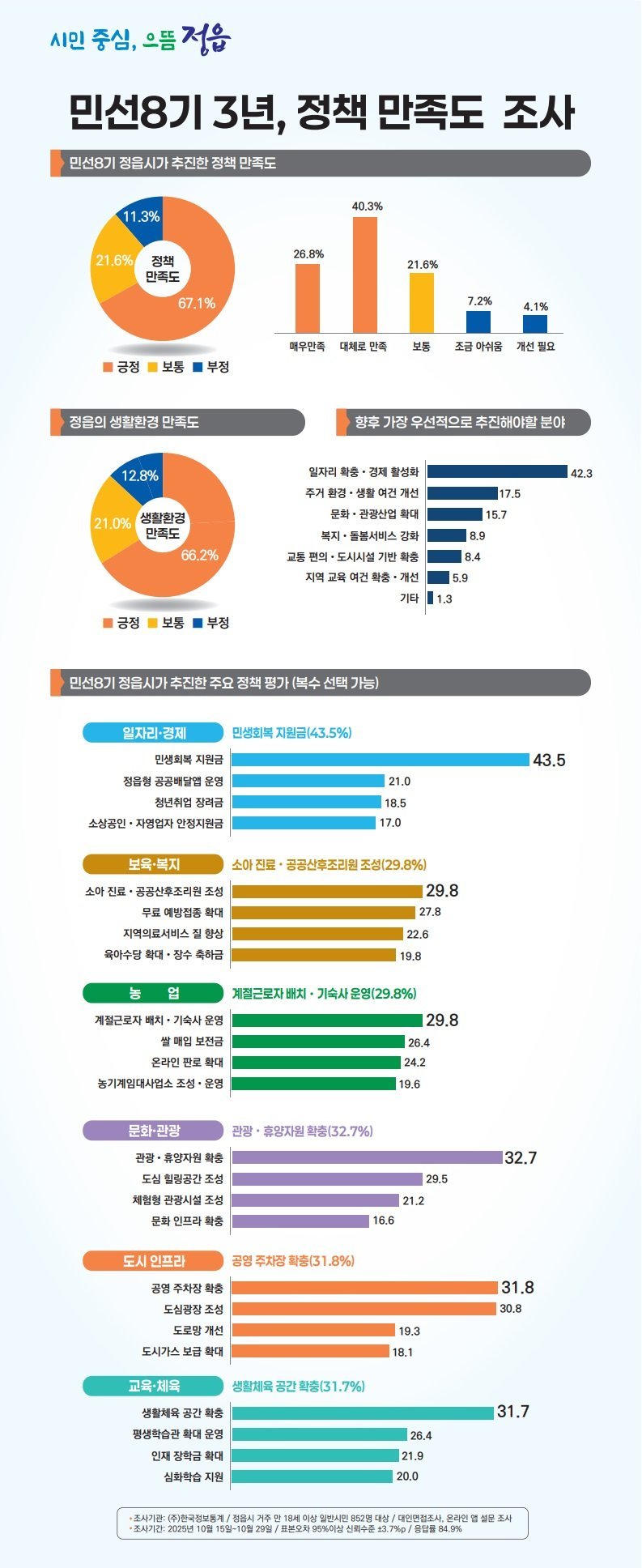 정읍시민 10명 중 7명 “시정 만족”…보육·복지 분야 성과 ‘뚜렷’ (정읍시 제공) [PEDIEN] 정읍시가 전문 여론조사 기관에 의뢰해 실시한 ‘2025년 주요정책 만족도 조사’결과, 정책 전반에 대한 만족도는 67.1%를 기록했으며, 생활환경 만족도 역시 66.2%로 높게 나타났다.시는 시민이 체감하는 정책 효과를 객관적으로 분석하고 향후 시정 운영의 기초자료로 활용하기 위해 이번 조사를 실시했다.조사 결과, 정책 전반에 대해 ‘매우 만족’한다는 응답은 26.8%, ‘대체로 만족’은 40.3%로 집계돼 긍정 평가가 67.1%에 달했다.가장 우수한 성과를 낸 분야로는 ‘보육·복지’가 압도적인 1위를 차지했다.이어 문화·관광, 일자리·경제 순으로 나타났다.특히 보육·복지 분야는 여성 응답자의 42.0%가 지지해 남성보다 높은 만족도를 보였으며, 18~49세 젊은 층에서도 50% 이상의 높은 지지를 받았다.각 분야별 세부 정책에 대한 선호도 조사에서는 시민들이 체감하는 실질적인 혜택이 만족도에 큰 영향을 미친 것으로 나타났다.△일자리·경제 분야에서는 ‘생활안정 지원금’이 43.5%로 가장 높은 지지를 받았다.특히 경제 활동이 왕성한 40대에서 50.3%의 높은 선호도를 보였다.△보육·복지 분야는 ‘소아 진료 및 공공산후조리원 조성’과 ‘무료 예방접종 확대’가 꼽혔다.30·40세대는 소아 진료 환경 개선에, 60세 이상은 예방접종 혜택에 더 큰 점수를 줬다.△농업 분야는 ‘계절근로자 배치 및 기숙사 운영’과 ‘쌀 매입 보전금’이 △도시 인프라 분야는 ‘공영 주차장 확충’과 ‘도심광장 조성’이 주요 성과로 평가받았다.다만, 향후 정읍시가 가장 우선적으로 힘써야 할 분야로는 ‘일자리 확충 및 경제 활성화’가 42.3%로 1순위로 꼽혔다.특히, 청년층의 안정적 지역 정착, 산업 변화에 대응한 신규 일자리 확보, 골목상권·소상공인 지원 등에 대한 요구가 높았다.시는 이번 조사 결과를 바탕으로 청년·신혼부부 주거지원 강화, 청년·중장년 고용지원 확대, 기업유치 및 창업보육 기반 강화, 지역상권 회복·활성화 정책 등 다양한 일자리·경제 정책을 한층 강화해 나갈 계획이다.이학수 정읍시장은 “이번 조사 결과는 시민이 체감하는 정책 효과를 객관적 데이터로 확인한 것에 의미가 있다”며 “조사 결과를 토대로 정책을 더욱 보완하고, 시민의 삶이 더 나아질 수 있도록 분야별 개선 방향을 세심히 검토하겠다”고 밝혔다.한편, 이번 조사는 여론조사 전문기관인 ㈜한국정보통계에 의뢰해 지난 10월 15일부터 29일까지 진행됐다.정읍시에 거주하는 만 18세 이상 남녀 852명을 대상으로 대인 면접과 온라인 앱 설문을 병행해 실시했으며, 표본오차는 95% 신뢰수준에서 ±3.7%p, 응답률은 84.9%다. -