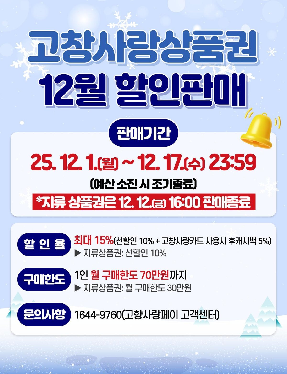 카드뉴스 고창사랑상품권 12월 할인판매 [PEDIEN] 고창군이 연말 지역 소비 촉진과 소상공인 매출 증대를 위해 12월 고창사랑상품권을 최대 15% 할인율로 판매한다고 1일 밝혔다.15% 할인판매는 구매 시 선할인 10%를 제공하고, 고창사랑카드 사용 시 결제금액의 5%를 캐시백으로 추가 지급하는 방식이다. 군은 이를 통해 군민들에게 실질적인 소비 혜택을 제공하고, 지역 상권 활성화에도 기여할 것으로 기대하고 있다.이번 12월 할인판매는 고창사랑카드는 12월17일 자정 전까지, 지류상품권의 경우 12월12일 오후 4시까지 구매할 수 있다.지류상품권은 기존과 동일하게 10% 선할인, 월 30만원 한도가 유지된다. 상품권은 우체국을 제외한 관내 모든 금융기관에서 구매할 수 있다.군은 지역경제 활성화를 위해 고창사랑상품권을 적극 발행하며, 군민들의 소비생활 중심으로 자리매김하도록 운영하고 있다.특히 민생경제 회복을 위해 올해 1~3월 전국 최고 수준인 20% 특별할인을 시행했다. 올해 약 800억원 규모의 상품권을 발행하여 지역 내 소비 선순환 효과를 극대화했다. 군은 앞으로도 고창사랑상품권 활성화를 통해 지역 경제에 힘을 보탤 계획이다. -