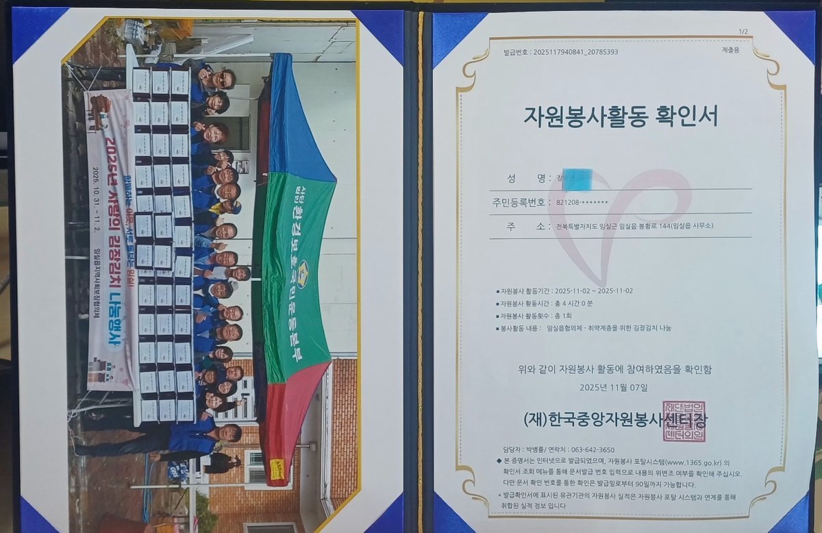 임실읍, 청장년 장애 가구에 자원봉사확인서 전달 (임실군 제공) [PEDIEN] 임실읍이 지역 내 청장년 장애인 7가구에 자원봉사활동확인서를 전달하며 훈훈한 감동을 선사했다.이번 확인서는 임실읍 지역사회보장협의체가 주관한 '사랑의 김장 나눔' 행사에 자원봉사자로 참여한 이들에게 전달된 것으로, 단순한 물품 지원을 넘어 함께 땀 흘리며 나눔의 가치를 실천했다는 점에서 의미가 깊다.봉사확인서를 전달받은 한 주민은 김장 봉사에 참여하며 다른 봉사자들과 함께 배추를 나르는 등 힘든 과정 속에서도 즐거움을 느꼈다고 소감을 밝혔다. 그는 작은 봉사였지만 상장처럼 확인서를 받으니 봉사에 대한 뿌듯함을 느낀다고 덧붙였다.송기찬 임실읍장은 봉사 참여를 흔쾌히 결정해준 이들에게 감사를 표하며, 이번 봉사활동을 통해 지역사회 나눔 문화가 더욱 확산되기를 바란다고 전했다. 임실읍은 앞으로도 다양한 봉사활동 기회를 제공하여 지역 주민들의 적극적인 참여를 유도하고, 따뜻한 공동체 조성에 힘쓸 계획이다. -