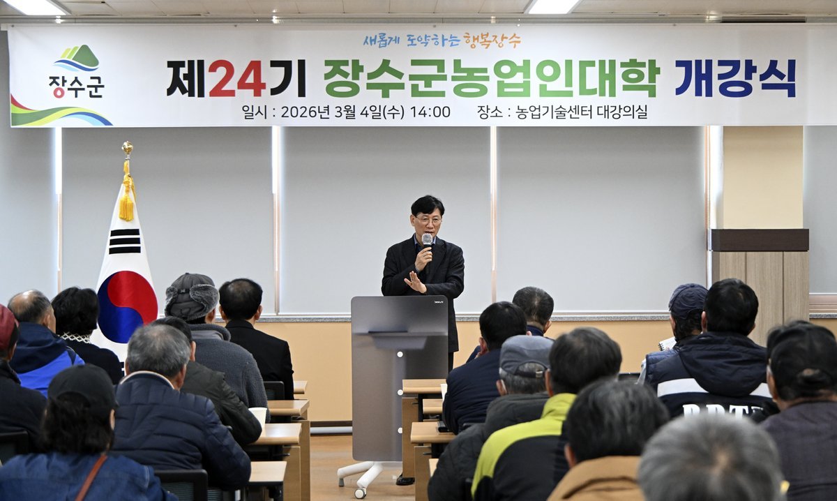 장수군, 제24기 농업인대학 개강식 개최 (장수군 제공) [PEDIEN] 장수군은 4일 농업기술센터 대강의실에서 교육생 80여명이 참석한 가운데 ‘제24기 장수군 농업인대학’개강식을 개최하고 본격적인 교육 운영에 들어갔다.이날 개강식은 최훈식 장수군수의 격려사를 시작으로 교육 일정과 운영 방향 안내, AI 활용 농업 경영 및 마케팅 특강 순으로 진행됐으며 변화하는 농업 환경에 능동적으로 대응하기 위한 교육의 출발을 알렸다.올해 농업인대학은 사과반 두릅반 신규농업인 기초영농반 등 3개 과정으로 운영되며 3월부터 11월까지 총 33회, 142시간에 걸쳐 체계적인 교육이 진행된다.군은 각 과정마다 전문 강사진의 지도 아래 이론 교육과 현장 실습을 병행하는 방식으로 운영해 작목별 전문기술 습득과 농업 경영 역량 강화를 동시에 도모할 계획이다.이를 통해 농업인들이 생산기술뿐만 아니라 경영과 마케팅 능력을 함께 갖춘 전문 농업인으로 성장할 수 있도록 교육의 실효성을 높이고자 한다.특히 군은 최근 농업 분야에서도 디지털 전환이 가속화되는 흐름을 반영해 AI 기반 농업 경영과 온라인 마케팅 전략을 접목한 특강을 마련해 농업인의 경쟁력 강화에 중점을 두고자 한다.장수군은 올해 농업인대학이 농업 현장에 새로운 기술과 경영 방식을 접목해 농가 소득 향상과 지속 가능한 지역 농업 기반 구축에 기여할 것으로 기대하고 있다.최훈식 군수는 “농업인들이 배움에 대한 열정을 바탕으로 시대와 환경 변화에 맞는 전문기술을 갖추고 지역 농업을 선도하는 핵심 인재로 성장해 나가길 바란다”며 “앞으로도 지역 특화작목 중심의 맞춤형 교육을 강화해 전문농업경영인 양성에 힘쓰겠다”고 밝혔다.한편 장수군 농업인대학은 2003년 개설 이후 현재까지 총 22기 2200여명의 졸업생을 배출하며 지역 농업 발전을 이끄는 핵심 교육 프로그램으로 자리매김하고 있으며 경쟁력 있는 농업 인재 양성을 통해 장수 농업의 지속 가능한 성장 기반을 강화해오고 있다. -