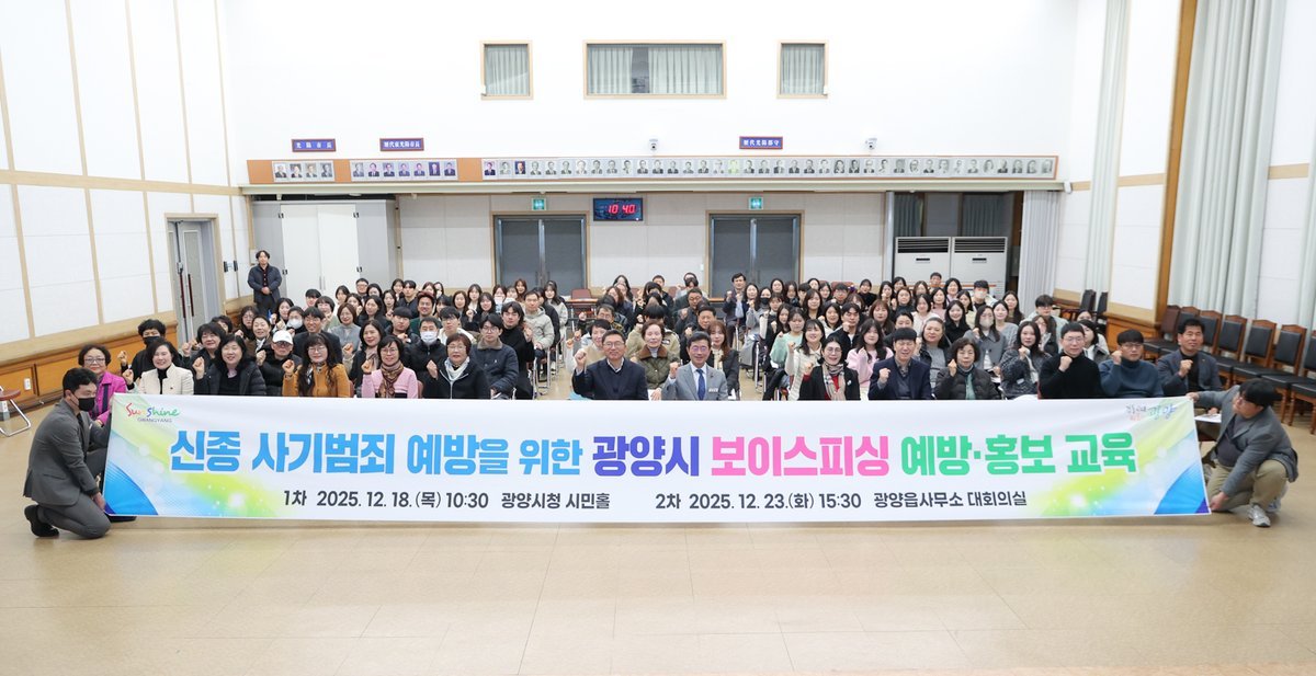 광양시, 시민 대상 보이스피싱 예방·홍보 교육 실시 (광양시 제공) [PEDIEN] 광양시는 최근 중앙부처·지자체 공무원 사칭 범죄와 개인정보 유출 등으로 보이스피싱 피해 우려가 커짐에 따라, 18일 시청 시민홀에서 시민 대상 보이스피싱 예방·홍보 교육을 실시했다고 밝혔다.이번 교육은 시민들의 보이스피싱 대응 역량을 높이기 위해 마련됐으며, 중마동권과 광양읍권으로 나눠 총 2회에 걸쳐 진행된다.중마동권 시민을 대상으로 한 이번 1차 교육은 △보이스피싱 탐지력 테스트 △유형별 주요 사기 수법 안내 △실제 피해사례 영상 시청 △상황별 대응 요령 설명 순으로 진행됐다.특히 지능화·고도화되고 있는 최신 사기 수법을 실제 피해 영상을 통해 설명하는 사례 중심 교육으로 시민들의 이해도를 높였으며, 일상생활에서 바로 활용할 수 있는 실질적인 예방법을 중점적으로 전달했다.교육에 참석한 한 시민은 “막연히 알고 있던 보이스피싱 수법을 실제 사례로 보니 훨씬 실감이 났다”며 “의심스러운 상황에서 어떻게 대응해야 하는지 구체적으로 알게 돼 큰 도움이 됐다”고 소감을 전했다.시 관계자는 “보이스피싱은 연령과 직업을 불문하고 누구나 피해자가 될 수 있는 범죄”라며 “이번 교육이 어르신 등 디지털 금융 취약계층은 물론 소상공인과 일반 시민 모두가 스스로를 보호하는 방법을 아는 계기가 되길 바란다”고 말했다.이어 “최근 시청 공무원을 사칭해 물품 대리 구매를 요구하는 사례가 발생하고 있으나, 광양시청 공무원은 어떠한 경우에도 금전을 요구하지 않는다”며 “의심스러운 전화나 공문을 받았을 경우 반드시 시청 공식 대표전화나 해당 부서로 확인해 피해를 사전에 차단해 달라”고 당부했다.한편, 2차 광양읍권 교육은 12월 23일 오후 3시 30분, 광양읍사무소 대회의실에서 진행되며 시민 누구나 자유롭게 참석할 수 있다. -