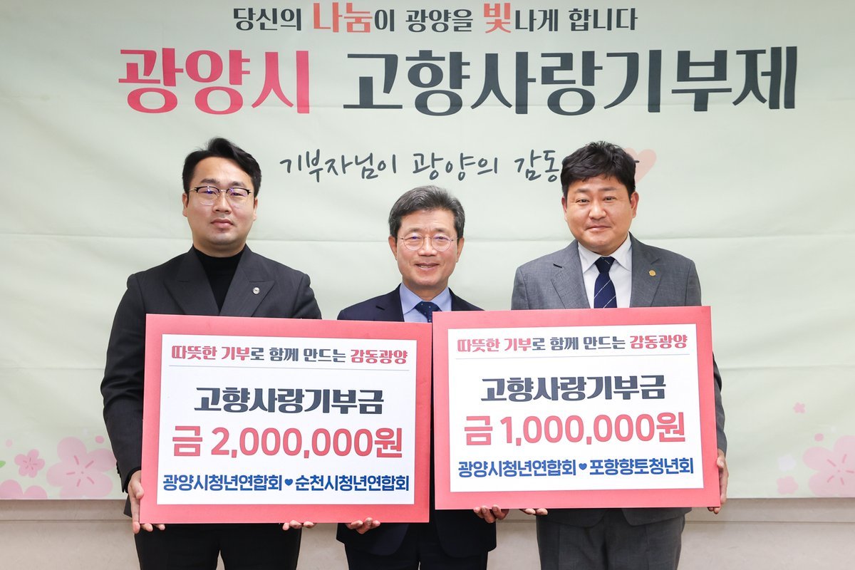 광양시청년연합회 고향사랑 상호기부로 상생 협력 이끈다 - 총무과 기탁식 [PEDIEN] 광양시는 15일 시청 만남실에서 광양시청년연합회 회원 일동의 고향사랑기부금 전달식이 열렸다고 밝혔다.광양시청년연합회는 자매결연 청년단체들과 고향사랑 상호기부의 취지를 공유하며 상호기부를 추진했으며, 포항향토청년회와 100만 원, 순천시청년연합회와 200만 원을 상호 기부해 총 300만 원을 기탁했다.광양시청년연합회는 지난해에도 포항향토·제주시·영천시·순천시 4개 지자체 청년연합회와 단체별 200만 원씩 총 800만 원을 상호 기부하며 고향사랑기부제 확산에 적극 참여한 바 있다. 올해까지 이어진 상호기부는 고향사랑기부제를 매개로 한 청년단체 간 연대와 상생의 모범사례로 평가된다.안타국 광양시청년연합회 회장은 “고향사랑기부제를 통해 청년들이 고향 발전에 직접 힘을 보탤 수 있어 더욱 뜻깊다”며 “이번 상호기부가 청년단체를 넘어 지역사회 전반으로 확산돼 고향의 지속 가능한 성장에 큰 힘이 되길 바란다”고 말했다.시 관계자는 “광양시의 든든한 미래 주역인 청년들이 고향을 위해 뜻을 모아줘 큰 힘이 된다”며 “청년들이 자부심을 가지고 활발히 활동할 수 있도록 관련 정책 발굴과 시정 발전에 더욱 힘쓰겠다”고 밝혔다. -