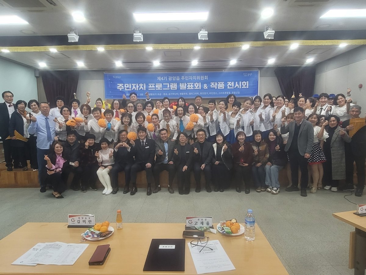 제4기 광양읍주민자치프로그램 수강생 작품발표회 성료 - 광양읍 단체 [PEDIEN] 광양시 광양읍주민자치위원회가 지난 12월 11일 광양읍사무소 대회의실에서 제4기 주민자치프로그램 수강생 작품발표회를 성황리에 개최했다고 밝혔다.이번 발표회는 퓨전장구의 힘찬 공연을 시작으로 팬플루트, 라인댄스, 숟가락난타 총 4개 팀이 무대에 올라 그동안 갈고닦은 실력을 선보이며 관람객들의 큰 호응을 얻었다.광양읍사무소 1층 로비에서는 수강생들이 직접 제작한 캘리그라피 작품 40점을 전시해 풍성한 볼거리를 제공했다. 해당 작품들은 약 일주일간 전시돼 읍사무소를 방문한 주민들에게 문화 향유의 기회를 제공하며 좋은 반응을 얻었다.고재율 광양읍주민자치위원장은 “어려운 여건 속에서도 이번 발표회를 위해 애써주신 수강생과 관계자 여러분께 감사드린다”며 “내년에는 보다 다양한 프로그램 운영을 통해 더 많은 주민이 함께 행복을 나누는 발표회로 이어지길 기대한다”고 밝혔다.김미란 광양읍장은 “멋진 공연과 정성껏 준비한 작품을 선보인 수강생 여러분께 감사드린다”며 “앞으로도 주민자치프로그램 활성화를 위한 지원과 협력을 지속해 나가겠다”고 말했다.한편, 광양읍은 내년 시범실시되는 주민자치회와 협력해 주민 수요와 최신 트렌드를 반영한 다양한 프로그램을 운영하고, 주민 참여 확대와 주민자치 활성화에 적극 나설 계획이다. -