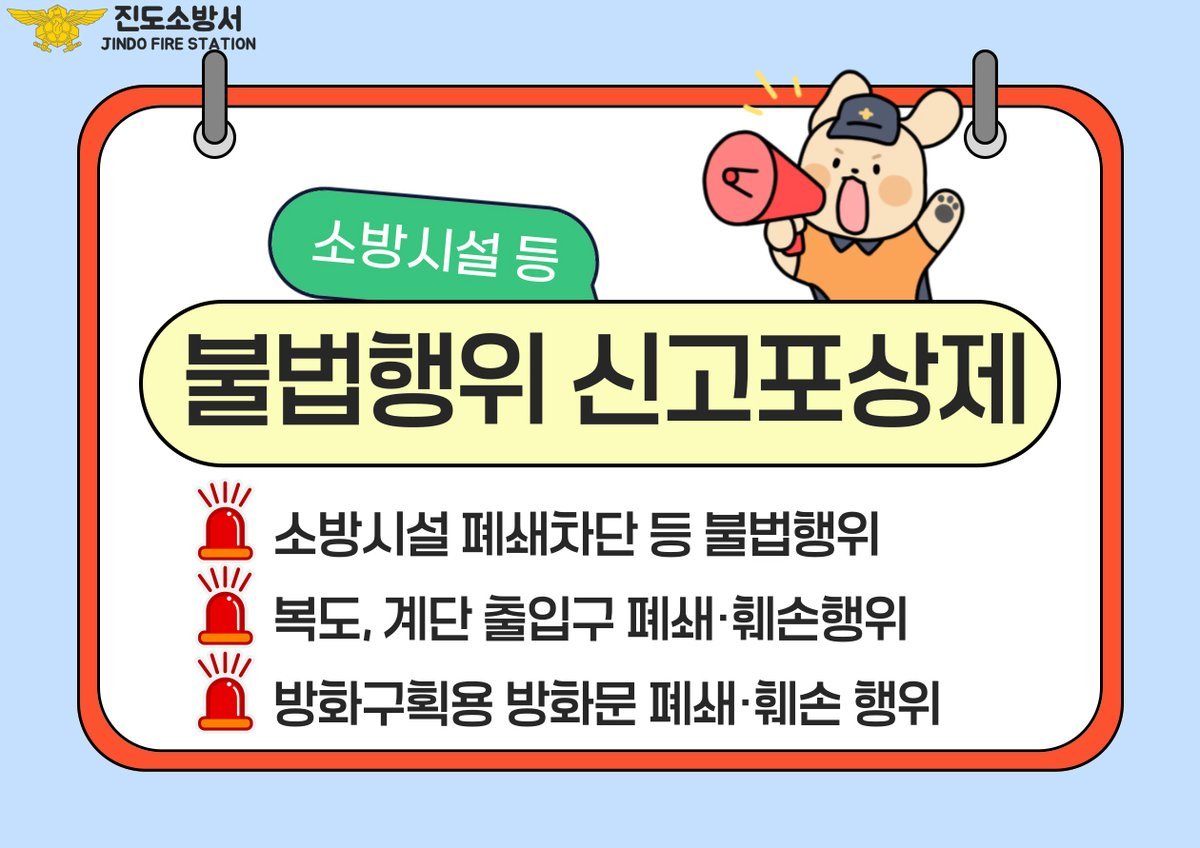 진도소방서, 소방시설 불법행위 신고포상제 운영 (진도군 제공) [PEDIEN] 진도소방서가 화재 발생 시 신속한 대피를 돕고 안전 관리를 강화하기 위해 소방시설 불법행위 신고포상제를 연중 운영한다고 밝혔다.이번 신고포상제는 비상구 폐쇄나 소방시설 차단 등 화재 시 인명 피해를 키울 수 있는 불법 행위를 근절하기 위함이다. 소방서는 군민들의 적극적인 참여를 유도하여 안전 의식을 높이는 데 집중할 계획이다.신고 대상은 소방시설 고장 방치, 비상구 물건 적치로 인한 통로 폐쇄, 방화셔터 훼손 및 장애물 설치 행위 등이다. ‘다중이용업소 안전관리에 관한 특별법’에 따른 업소와 특정소방대상물이 포상 대상 시설에 해당된다.불법 행위 최초 신고자에게는 5만 원 상당의 현금 또는 온누리상품권이 지급된다. 동일인이 2회 이상 신고할 경우 소화기나 단독경보형 감지기 등 5만 원 상당의 소방용품이 제공된다.다만, 동일 신고자에 대한 포상금은 월 최대 30만 원, 연간 300만 원을 초과할 수 없다.김재출 진도소방서장은 “비상구와 소방시설은 위급 상황에서 생명을 지키는 데 필수적인 요소”라며, 불법행위에 대한 자발적인 신고를 통해 안전 문화가 확산되기를 바란다고 전했다. 소방서는 이번 신고포상제를 통해 군민들의 안전 의식을 고취하고, 화재로부터 안전한 진도군을 만드는 데 기여할 것으로 기대한다. -