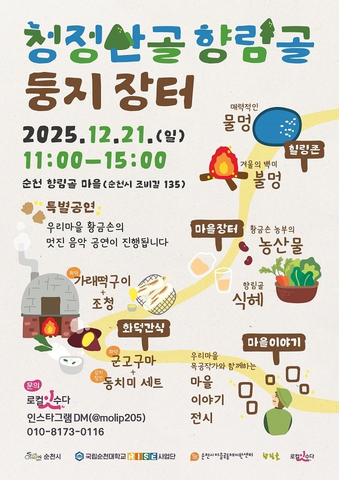 순천시, 오는 21일 ‘청정산골 향림골 둥지장터’개최 (순천시 제공) [PEDIEN] 순천의 대표적인 청정 산골마을, 삼산동 향림골에서 오는 21일 특별한 장터가 열린다. 마을 주민들이 직접 생산한 농산물과 정성껏 준비한 먹거리를 선보이는 '청정산골 둥지장터'가 오전 11시부터 오후 3시까지 방문객을 맞이한다.이번 장터는 국립순천대학교 RISE사업단, 순천시마을공동체지원센터와 함께 진행하는 '우리동네 리빙랩 프로젝트'의 결과물을 공유하는 자리다. 향림골 주민들은 이 프로젝트를 통해 마을의 매력을 알리고, 주민 주도형 프로그램을 소개하기 위해 장터를 기획했다.장터에서는 향림골 주민들의 손맛이 담긴 다양한 겨울 먹거리를 맛볼 수 있다. 화덕 군고구마, 김치 장인의 동치미 세트, 화덕 가래떡 구이, 직접 담근 식혜 등 정성이 가득한 음식들이 준비되어 있다. 또한, 주민들이 직접 재배한 농산물도 소량 판매할 예정이다.방문객들을 위한 특별한 공간도 마련된다. '물멍 ZONE'과 '불멍 ZONE'에서는 겨울 산골마을의 정취를 느끼며 편안하게 휴식을 취할 수 있다. 이와 더불어 마을 목공 작가와 주민들이 함께 만든 작품 전시, 주민들의 특별 공연도 준비되어 있어 장터를 더욱 풍성하게 만들 것으로 기대된다.향림골 관계자는 이번 둥지장터가 단순한 장터를 넘어 마을의 활력을 되찾는 계기가 되기를 바란다고 전했다. 또한, 향림골의 따뜻한 정을 느끼고 싶은 모든 사람들을 환영한다고 밝혔다. -