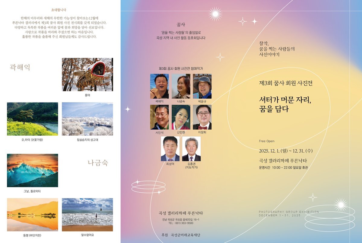 [PEDIEN] 전남 곡성군의 사진작가 모임 '꿈을 찍는 사람들'이 세 번째 사진전을 개최하며 지역민과의 소통에 나선다.이번 사진전은 12월 1일부터 31일까지 곡성 지역의 갤러리카페 푸른낙타에서 진행된다. '꿈사'는 이번 전시회를 통해 한 해 동안 회원들이 각자의 시선으로 담아낸 열정적인 작품들을 지역 주민들과 공유할 예정이다.'꿈사'는 곡성 지역 사진작가들이 모여 창립한 단체로, 이번 전시회는 그들의 세 번째 공식 전시회다. 지역 사회와의 문화 교류를 활발히 하고, 사진을 통해 지역의 아름다움을 알리는 데 기여할 것으로 전망된다.