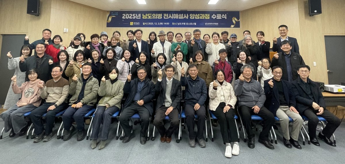 남도의병 전시해설사 양성교육 수료식 [PEDIEN] 전라남도가 2일 나주영상테마파크 유스호스텔 강당에서 2025년 남도의병 전시해설사 양성교육 수료식을 열어 전시해설사 69명을 배출하는 등 박물관 개관 준비가 순조롭게 진행되고 있다.남도의병 전시해설사 양성교육은 2026년 2월 개관 예정인 남도의병역사박물관의 전시해설사와 교육체험강사 인력을 양성하기 위해 진행됐다. 이번 과정은 지난 10월 개강해 총 12회 과정으로 이뤄졌으며, 교육 과정을 성실히 이수한 총 69명이 수료증을 전달받았다.교육은 임진왜란 전후 시기부터 대한제국 전후 시기까지 이어지는 남도의병의 역사 전반, 박물관 건립 과정과 전시 방향, 전시 유물에 대한 이해 등 전시해설사에게 요구되는 핵심 역량을 체계적으로 다뤘다.전남도는 별도의 선발 절차를 통해 전시해설사와 교육체험강사로 활동할 인력을 선발 배치할 예정이며, 전시해설사 양성교육 수료생에게는 향후 선발 과정에서 가산점이 부여된다.수료식에 앞서 김병인 전남대학교 사학과 교수가 ‘의향론의 형성과 전개’를 주제로 한 강연을 진행, 역사 속에서 펼쳐진 의병 투쟁에 관한 이해의 폭을 넓혔다.박중환 남도의병역사박물관 개관준비단장은 “남도의병의 정신을 도민과 관람객에게 생생하게 전달하는 전시해설은 박물관의 중요한 기능”이라며 “앞으로도 해설사와 교육체험강사의 역량 강화를 위한 다양한 교육 프로그램을 지속해서 운영할 계획”이라고 말했다. -