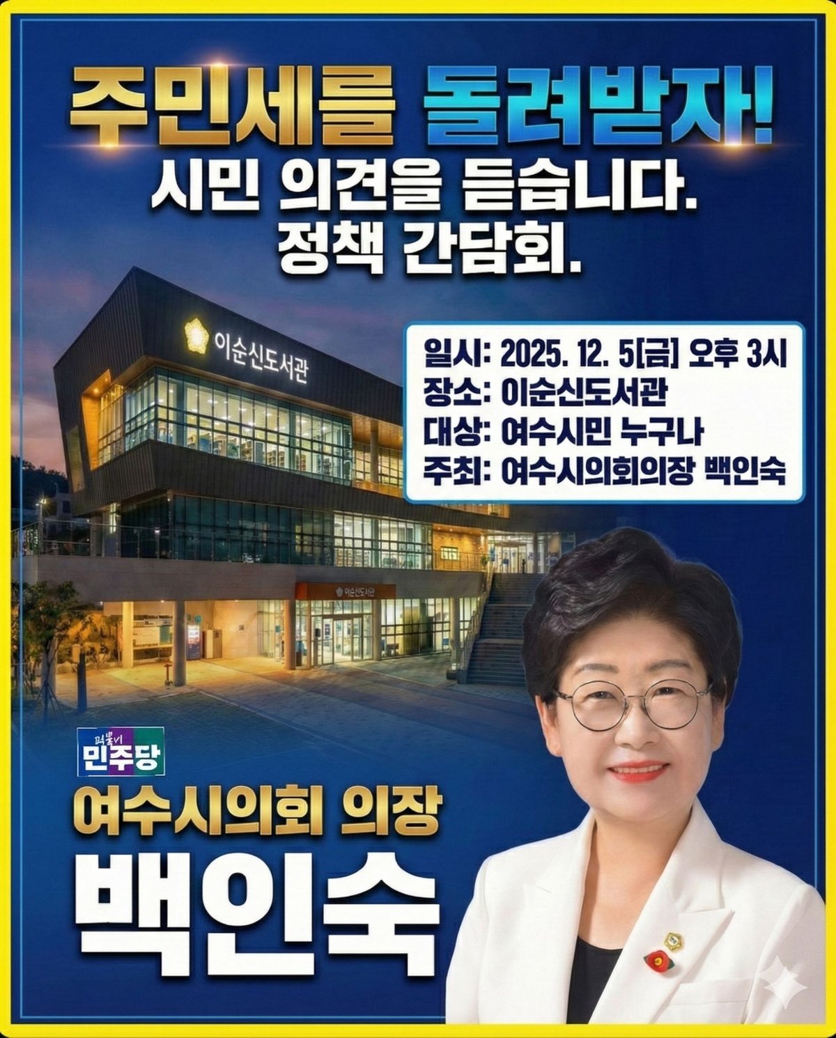 여수시의회 백인숙 의장, 12월 5일 주민세 환원·주민참여예산 실현 간담회 개최 (여수시 제공) [PEDIEN] 여수시가 주민세 환원을 통해 주민 주권 강화에 나선다.여수시의회 백인숙 의장은 12월 5일 이순신도서관에서 '주민세 지역 환원 조례 제정 및 주민참여예산제 실현 방안 마련 간담회'를 개최한다. 이번 간담회는 주민이 직접 제안하고 결정하는 '생활밀착형 자치 모델' 구축을 목표로, 주민참여예산제 개선과 주민세 환원 제도의 도입 가능성을 논의하기 위해 마련됐다.최근 순천, 당진 등 여러 지자체에서 주민세 환원 제도를 도입하여 주민 참여 확대와 지역 공동체 활성화에 긍정적인 효과를 거두고 있다. 이에 여수시도 주민이 낸 세금을 주민에게 환원하는 시스템 구축을 통해 실질적인 주민 주권 실현을 도모한다는 방침이다.간담회는 백인숙 의장의 인사말을 시작으로 여수지역발전협의회 박계성 이사장의 주제 발표, 읍·면·동 주민자치회장들의 의견 발표, 그리고 참석자 전체 질의응답 순으로 진행된다. 특히, 주민세 환원 제도가 현장에서 어떻게 활용될 수 있을지에 대한 구체적인 논의가 이루어질 예정이다.이번 간담회를 통해 여수시는 주민세의 읍면동 환원 기준, 주민자치회의 예산 권한 강화, 참여 예산의 실질적 권한 보장, 주민총회를 통한 직접 결정 구조 마련 등 제도 개선 방향을 심도 있게 검토한다.백인숙 의장은 “이번 간담회를 시작으로 여수시가 진정한 주민주권 시대를 열 수 있도록 제도적 기반을 하나씩 완성해 나가겠다”며, “주민세 주민 환원 조례 제정을 통해 주민이 결정하고, 주민이 실행하고, 주민이 평가하는 여수형 자치모델을 반드시 만들겠다”고 강조했다.