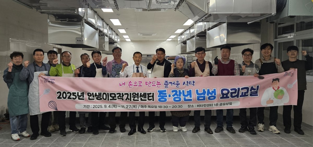 순천시 인생이모작지원센터, 중·장년 남성 요리 교실 호응 속에 끝마쳐 (순천시 제공) [PEDIEN] 순천시 인생이모작지원센터가 중장년 남성을 대상으로 운영한 요리 교실이 큰 호응 속에 마무리됐다.지난 9월부터 진행된 하반기 요리 교실은 46세에서 65세 사이의 남성 20명이 참여했다. 요리에 대한 높아진 관심을 반영하여, 혼자서도 건강한 식사를 준비할 수 있도록 돕는 데 초점을 맞췄다.가정식 전문 요리 강사가 영양과 건강을 고려한 메뉴를 선정하고, 수강생들은 재료 손질부터 조리까지 모든 과정에 직접 참여했다. 실습 위주의 수업은 참여자들의 만족도를 높였다.한 수강생은 “퇴직 후 무료했던 일상에 요리 교실 참여가 활력을 불어넣어 줬다”며 감사를 표했다. 순천시 관계자는 “첫 시도였음에도 불구하고 많은 관심과 참여 덕분에 성공적으로 마무리할 수 있었다”고 밝혔다.순천시는 앞으로도 중장년층의 인생 2막을 위한 다양한 프로그램을 개발할 계획이다. 프로그램 관련 문의는 인생이모작지원센터를 통해 가능하다. -