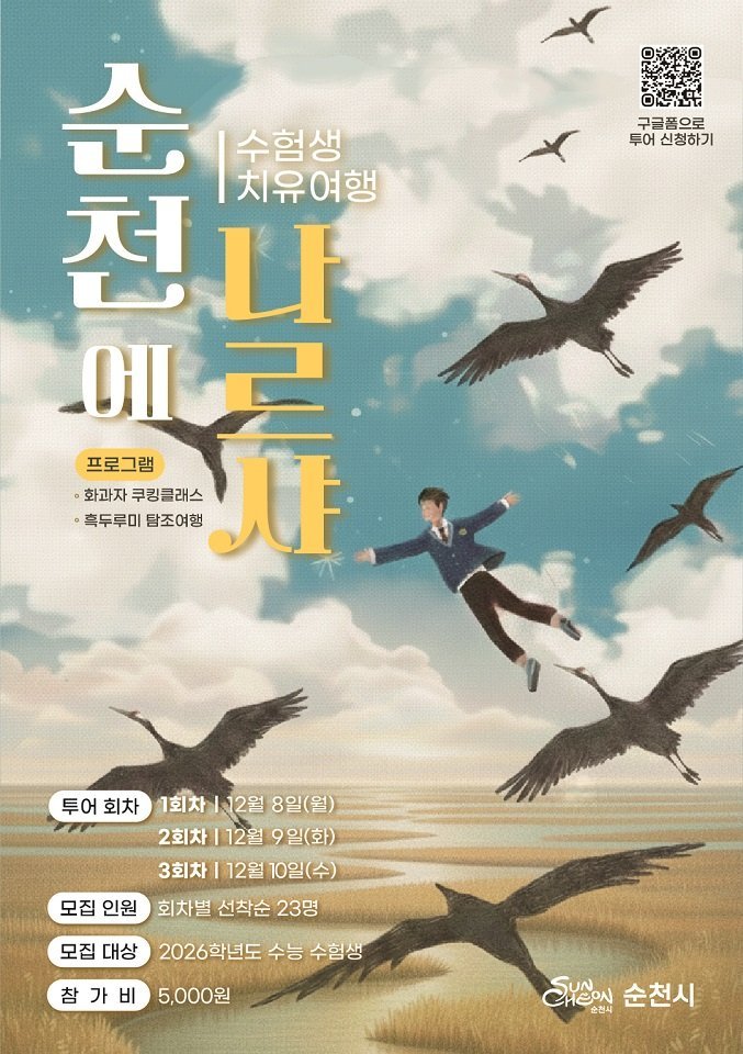 수험생에게 선물하는 감성 힐링 여행, ‘순천에 나르샤’운영 (순천시 제공) [PEDIEN] 순천시가 수능을 마친 청소년들을 위해 특별한 힐링 프로그램 '순천에 나르샤'를 8일부터 3일간 운영한다.수험 생활의 스트레스를 해소하고 새로운 시작을 응원하기 위해 마련된 이번 프로그램은 순천만의 아름다운 자연과 다채로운 감성 체험을 결합한 것이 특징이다.'순천에 나르샤'는 참가자들이 자연 속에서 편안하게 휴식을 취하며 긍정적인 에너지를 얻을 수 있도록 기획됐다. 프로그램은 감성 디저트 만들기, 흑두루미 탐조 및 일몰 감상, 필름 스냅 기록 등 세 가지 테마로 구성된다.참가자들은 전문 강사와 함께 디저트를 만들며 긴장을 풀고, 겨울 철새인 흑두루미를 관찰하며 자연의 아름다움을 만끽한다. 특히 1인당 1대의 필름카메라가 제공되어, 순천에서의 특별한 하루를 직접 기록하고 추억을 만들 수 있다.순천시 관계자는 수험생들이 잠시 숨을 고르며 자연 속에서 재충전의 시간을 갖기를 바란다고 전했다. 또한 행운의 상징인 흑두루미와의 만남이 수험생들의 새로운 시작에 긍정적인 기운을 불어넣어 주기를 기대한다고 밝혔다.이번 프로그램은 회차별 선착순 20명으로 진행되며, 참가 신청은 전화 또는 구글폼 QR코드를 통해 가능하다. -